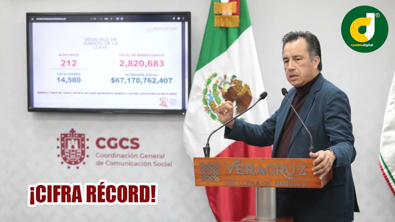 Veracruz, Ver.- Como una cifra récord calificó el gobernador de Veracruz, Cuitláhuac García Jiménez, los 67 mil 170 millones 762 mil 407 que durante el año pasado recibió Veracruz a través de 20 programas federales y de manera directa a los bolsillos de la población, "formando una base de consumo que mantiene a las cadenas productivas, dejando claro cómo la política social repercute en la economía”.