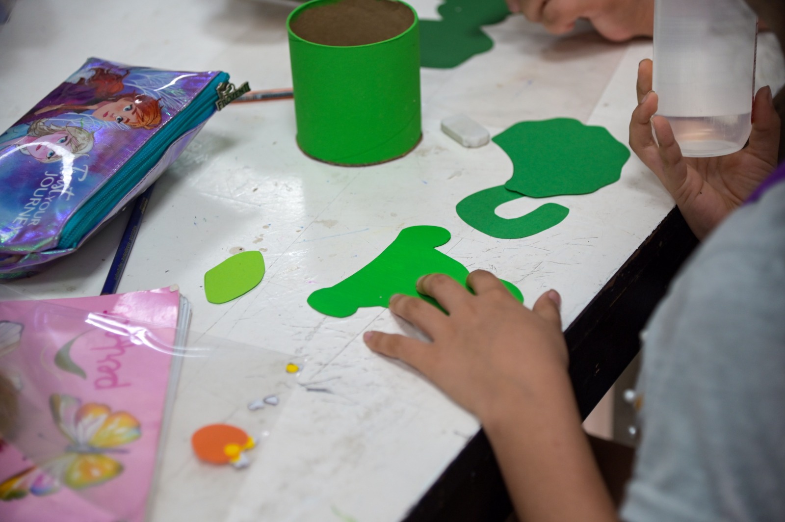 Además, se fomentó la escritura creativa invitando a cada niño a crear su propio dinosaurio, y se elaboraron lagartos gigantes utilizando materiales como origami, globos, fomi y elementos de reúso.