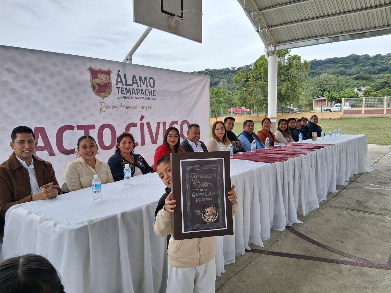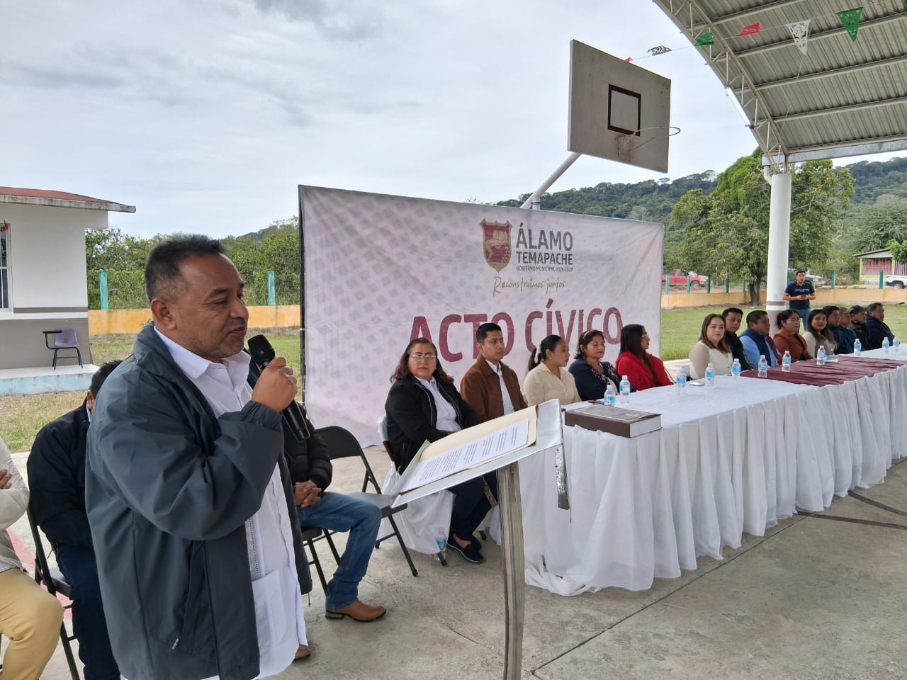 Álamo, Ver.- En el marco conmemorativo del 109 aniversario de la Constitución de 1917, el regidor primero Abimael Cabrera Del Ángel, en representación del alcalde Pepe Arenas, se pronunció por continuar caminando juntos, pueblo y gobierno, hasta conseguir la completa reconstrucción y el progreso general del municipio.