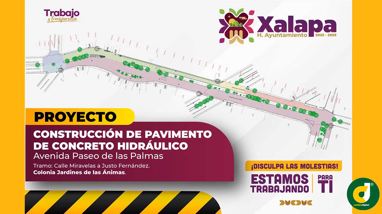 Xalapa, Ver.- Por los trabajos de pavimentación con concreto hidráulico que se realizan en la avenida Paseo de las Palmas, a partir del lunes habrá adecuaciones viales en la zona, con el fin de permitir un adecuado avance de la obra y afectar lo menos posible el flujo vehicular, por lo que se solicita a la población su comprensión, que programe sus recorridos y evite transitar por esta área sino es necesario.