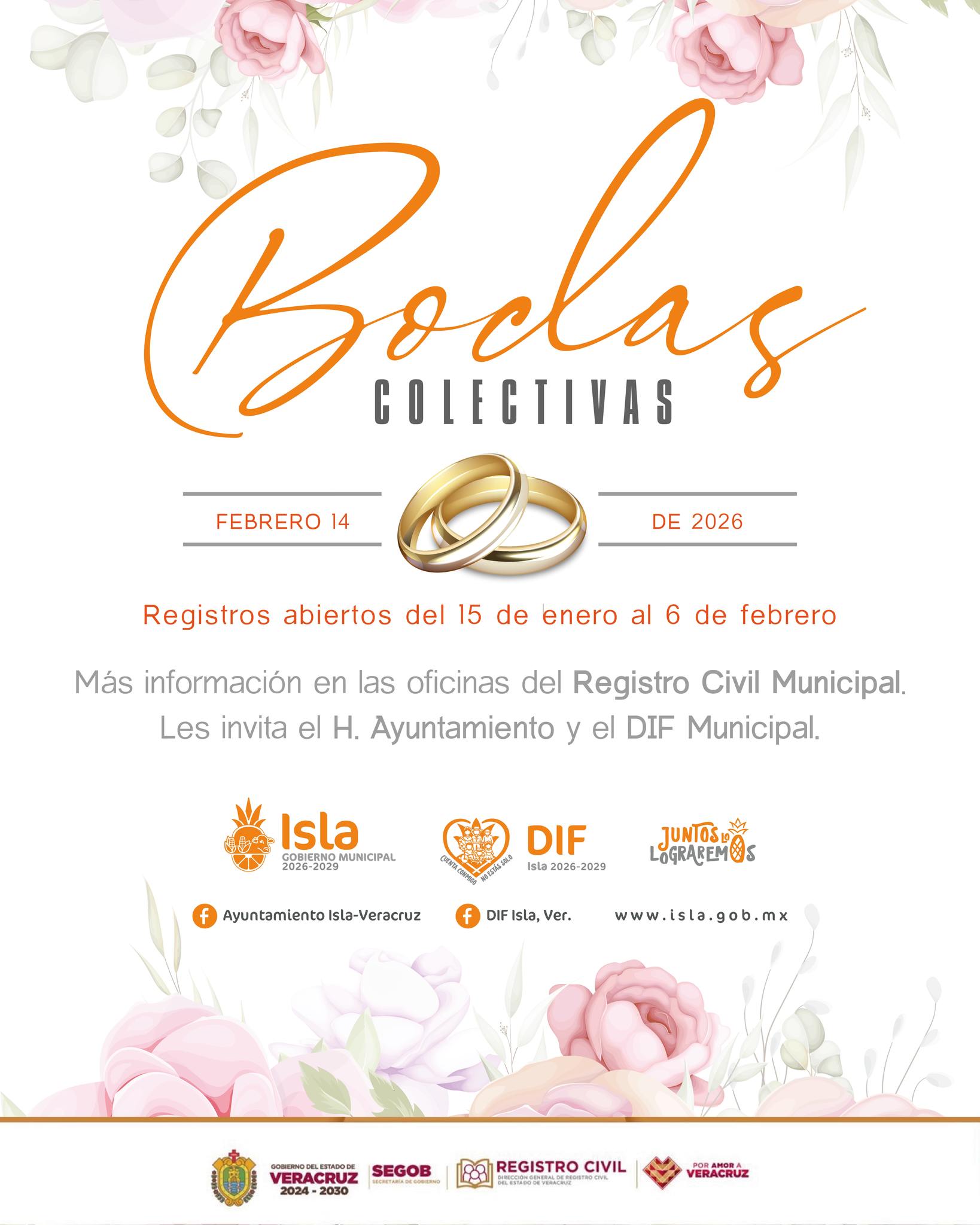 Isla, Ver.- El H. Ayuntamiento de Isla que encabeza Ramón Martínez Tress, en coordinación con el DIF municipal, invita a las parejas del municipio a participar en las Bodas Colectivas 2026, una oportunidad para formalizar su unión de manera legal.