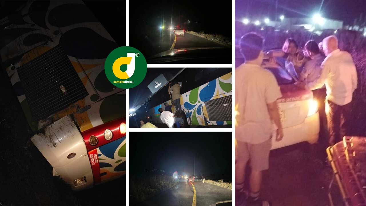 El autobús de la línea TRV quedó recostado a orillas de la carpeta asfáltica.