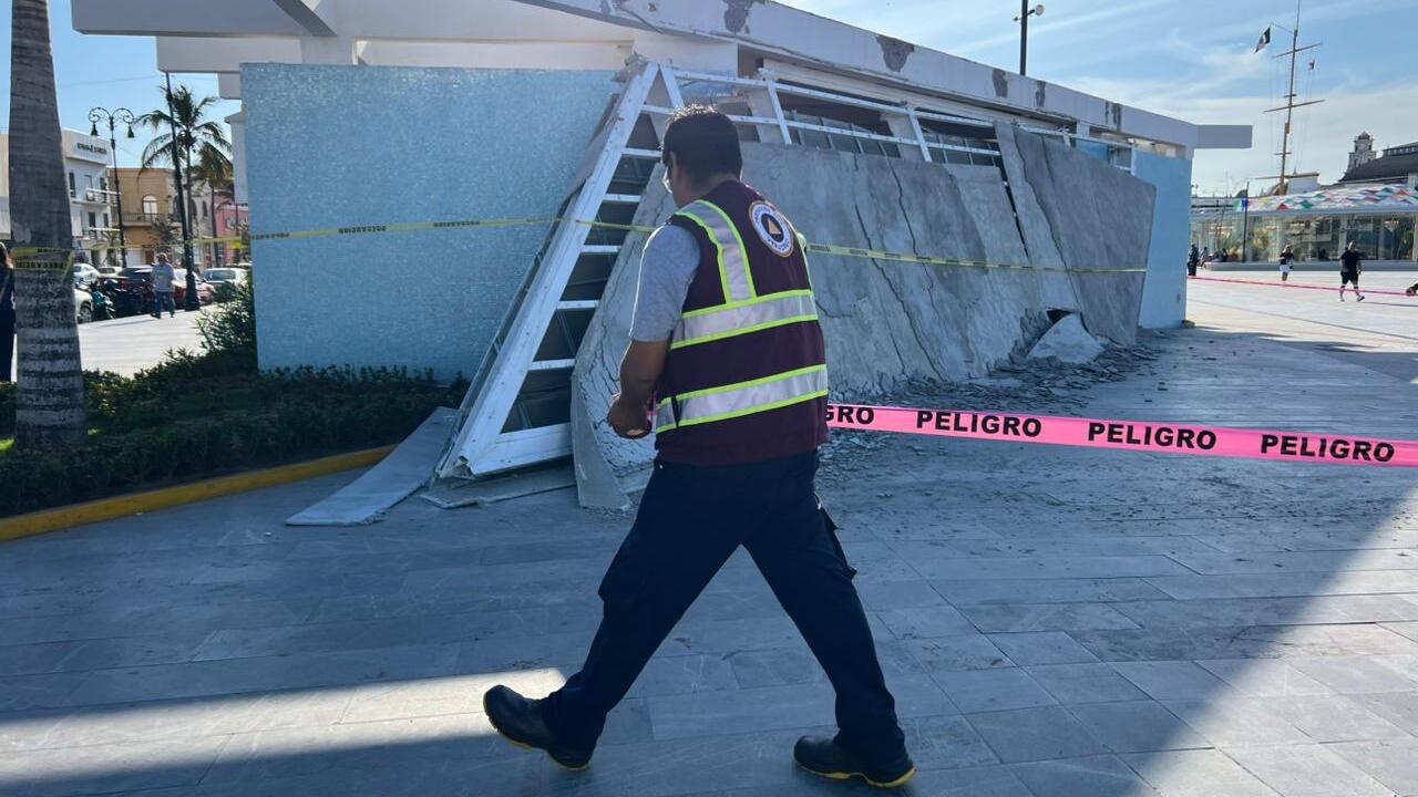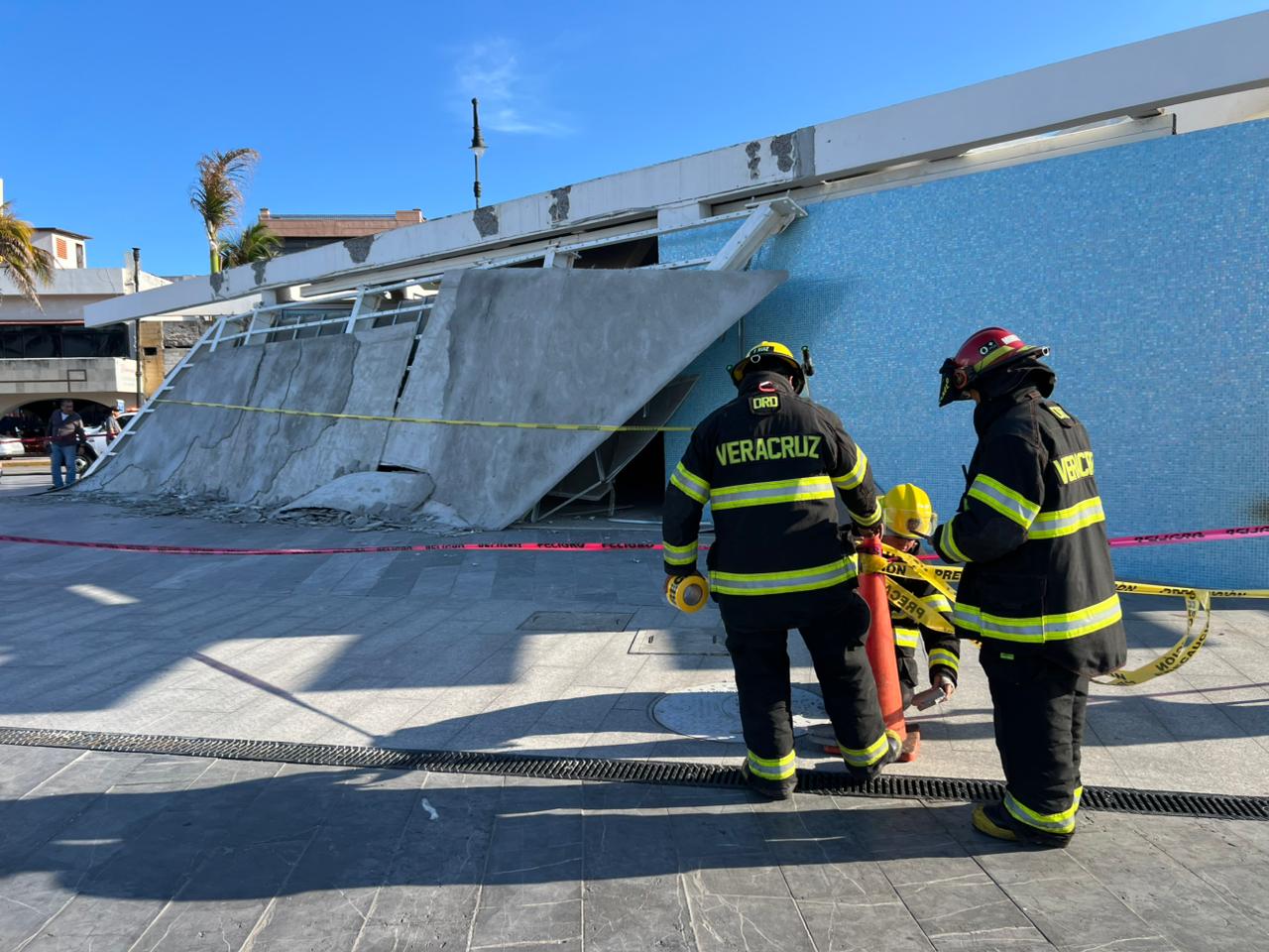 Veracruz, Ver.- Para salvaguardar la integridad de la población y de turistas, la dirección municipal de Protección Civil de Veracruz señalizó y acordonó la zona en donde hace unos momentos se registró el derrumbe parcial del techo de los locales de artesanías ubicados en la Plaza del Heroísmo Veracruz.