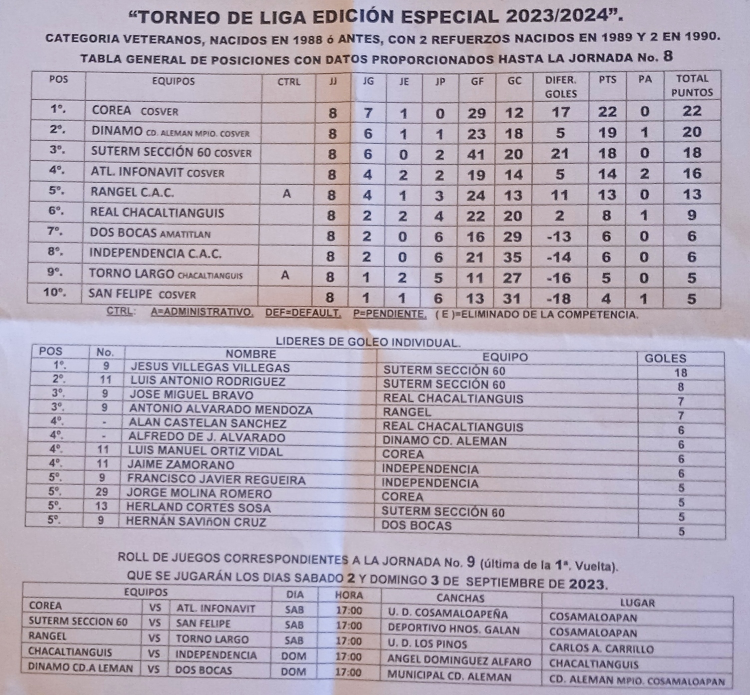 Para la última semana de juego de la primera vuelta del torneo de veteranos, Corea recibe al Atlético Infonavit, SUTERM Sección 60 al San Felipe, Rangel al Torno Largo, Chacaltianguis al Independencia y Dinamo Ciudad Alemán a Dos Bocas.