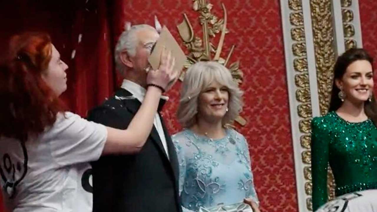 Activistas atacan de nuevo: Pastelazo a figura de cera de Carlos III
