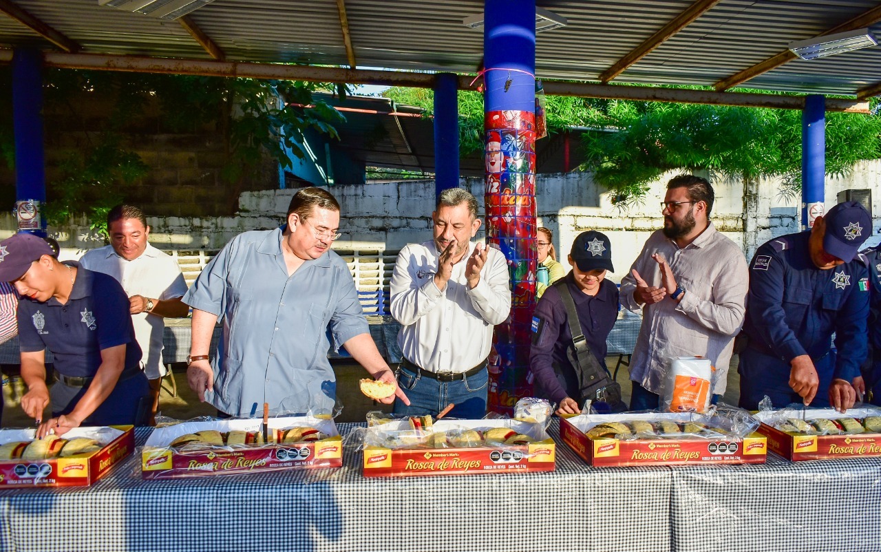 Coatzacoalcos, Ver.- El presidente municipal Amado Cruz Malpica visitó las instalaciones de la Dirección de Seguridad Pública Municipal de Coatzacoalcos para partir la tradicional ‘Rosca de Reyes’ con las y los integrantes de la corporación.