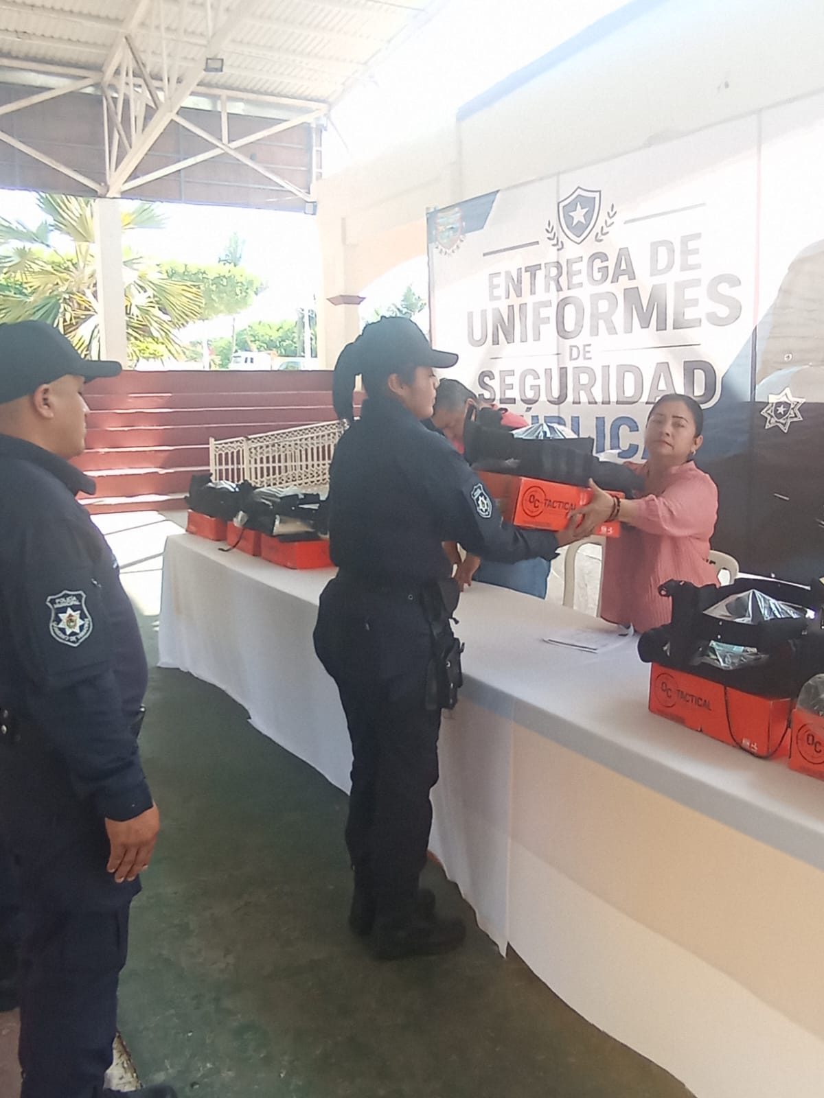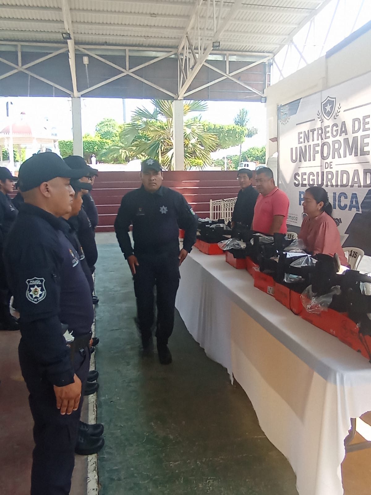Chinameca, Ver.- En cumplimiento con el compromiso de mejorar las condiciones para los elementos de la Policía Municipal de Chinameca, el alcalde Santiago Cortés Padua, realizó la entrega de uniformes a los elementos de esta corporación con la finalidad de dotar a los trabajadores de la indumentaria necesaria para desempeñar sus labores, así como la entrega de botas, cinturones, playeras, equipo de fornitura, porta esposas, porta gases, funda para pistola, funda para PR 24, bastón retráctil esposas y chalecos balísticos equipado incluye cargadores.