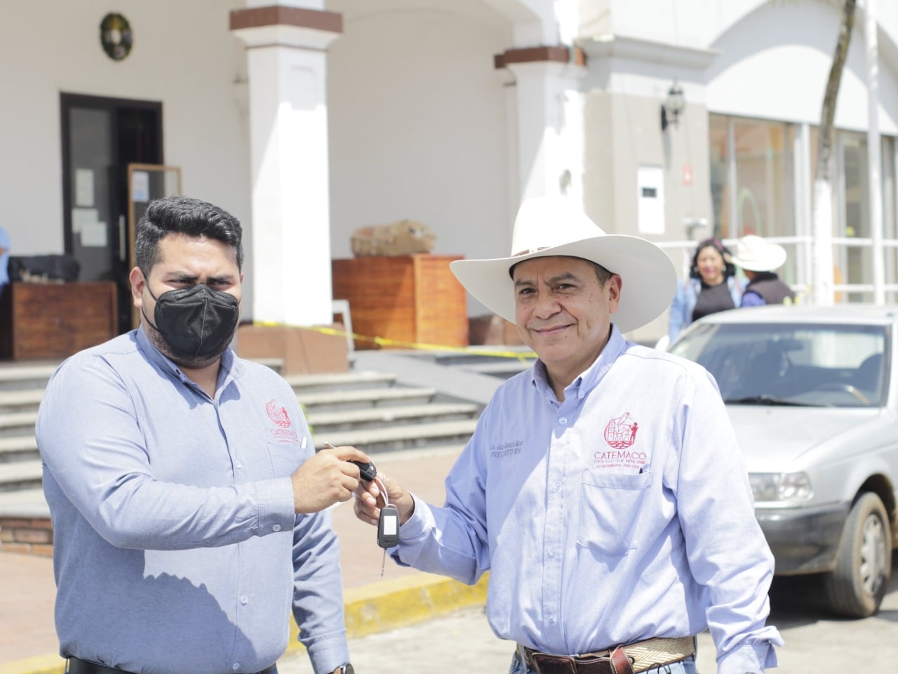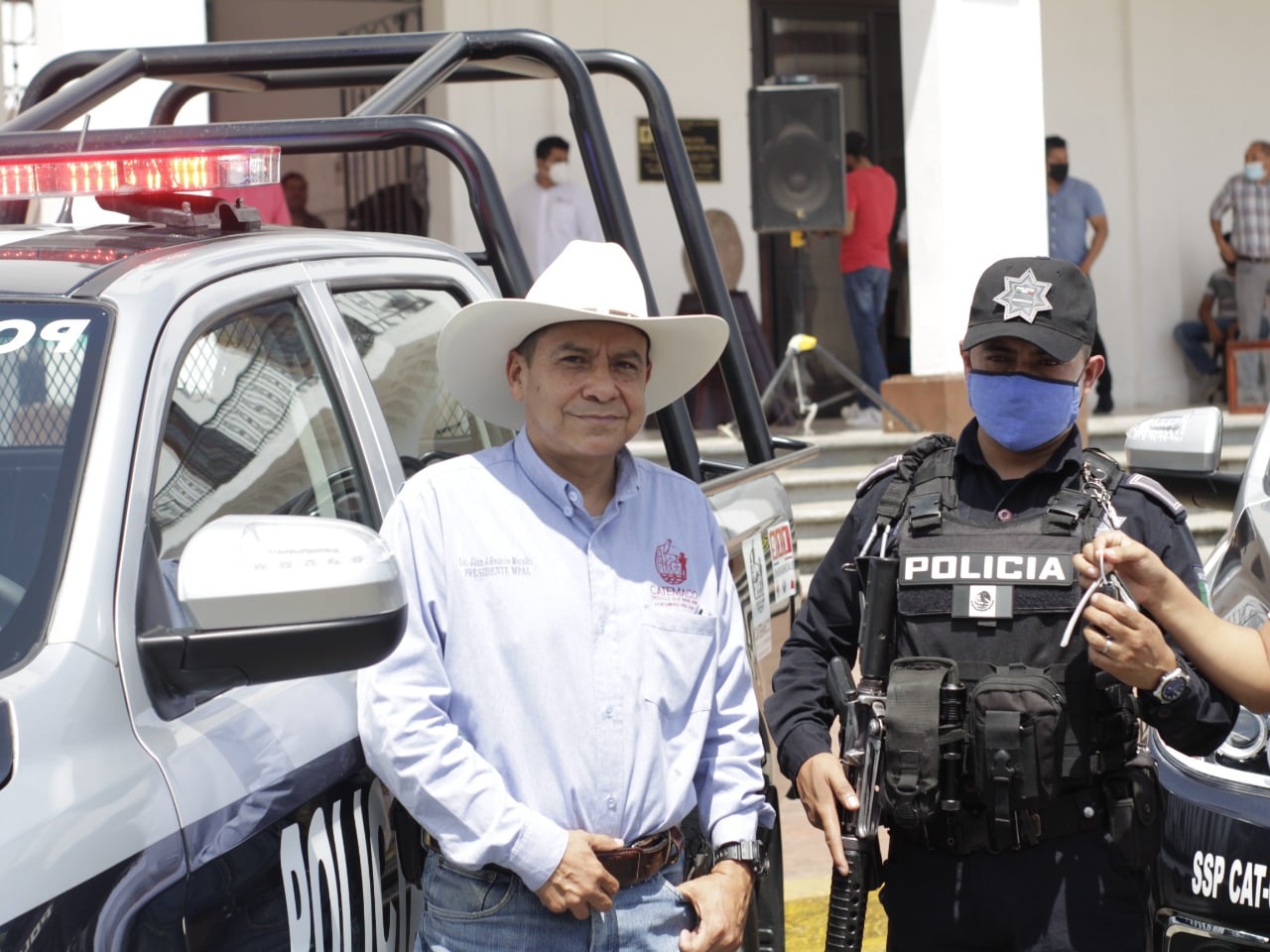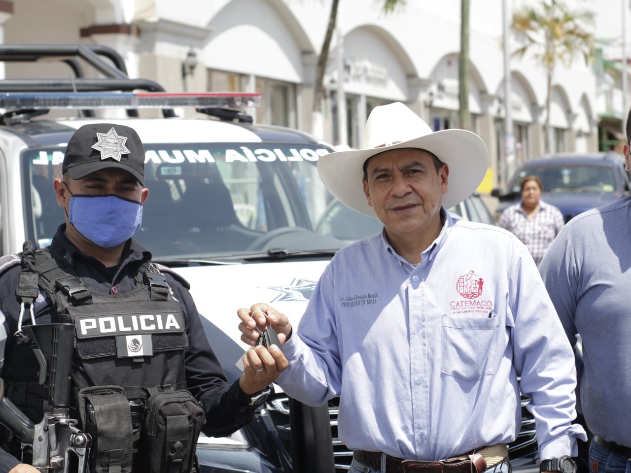 Catemaco, Ver.- Reiterando su compromiso con la ciudadanía de brindar seguridad en el municipio y de dignificar el cuerpo policiaco, dotándolo de vehículos en buenas condiciones, el presidente municipal Lic. Juan José Rosario Morales hizo entrega oficial de 3 patrullas al coordinador de Seguridad Pública Municipal Ing. Roger Alexander Echavarría Pérez, y al comandante de la Policía Municipal Efrén López Fernández.