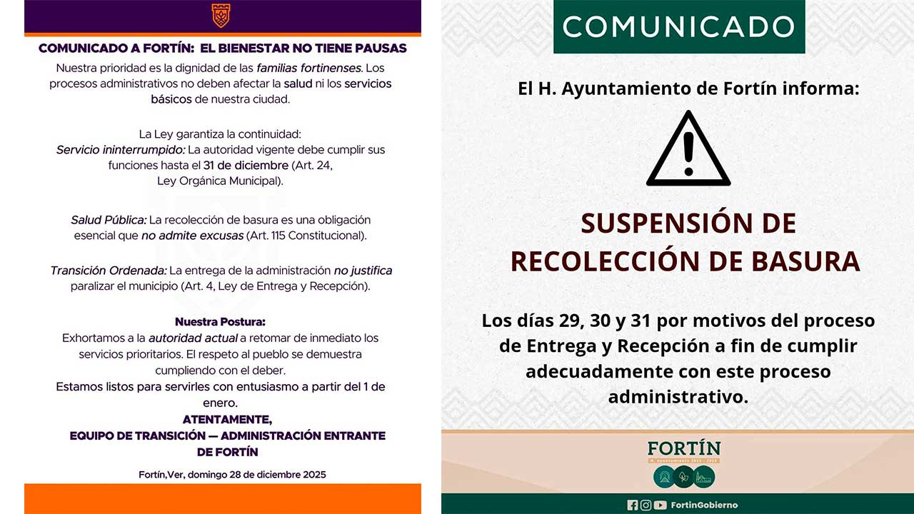 “Suspensión de recolección de basura los días 29, 30 y 31 por motivos del proceso de Entrega y Recepción a fin de cumplir adecuadamente con este proceso administrativo”, publicó.