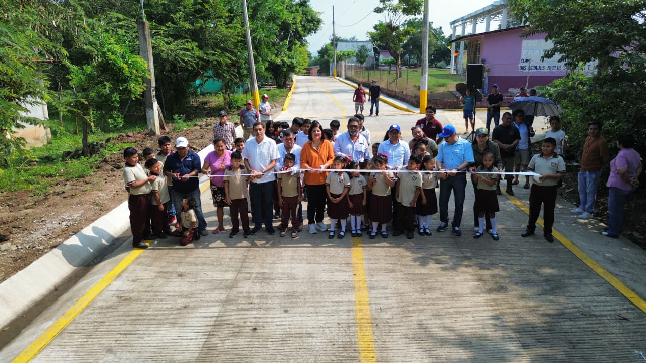 San Andrés Tuxtla Ver.- Cumpliendo con la mejora de vialidades y accesos principales que conectan a comunidades de la zona rural, y dejando obras significativas para este rubro en toda la geografía sanandrescana, la alcaldesa de San Andrés Tuxtla, la doctora María Elena Solana Calzada, inauguró en la comunidad de Dos Aguajes, la obra de pavimentación en la calle Francisco Villa, la cual abarca aproximadamente un kilómetro y cuenta además con cunetas en ambos extremos para garantizar larga vida y durabilidad a este camino.