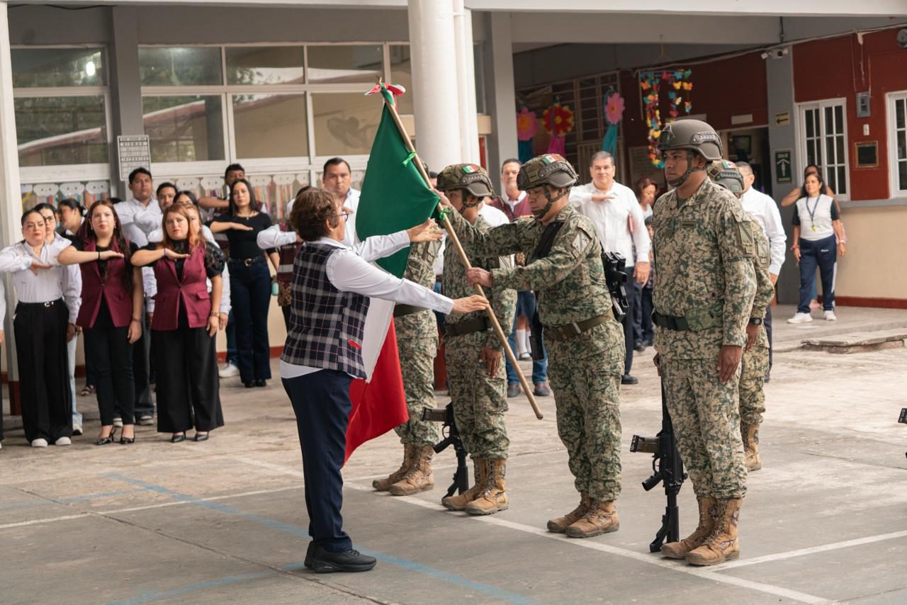 En su mensaje, la Presidenta Municipal, Adanely Rodríguez, subrayó que la formación en valores comienza desde el entorno más cercano: la escuela, la familia y la comunidad, destacando que la bandera nacional simboliza la historia, la identidad y los principios que deben guiar a la ciudadanía.