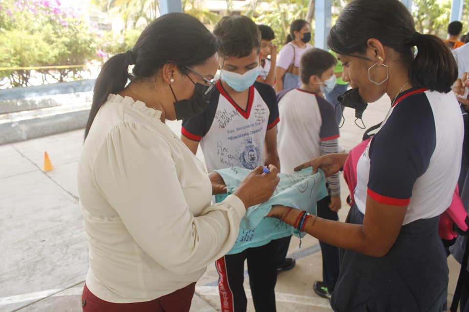 Con gran entusiasmo los estudiantes de la secundaria recibieron con porras a la alcaldesa y le pidieron la firma del recuerdo en sus uniformes.