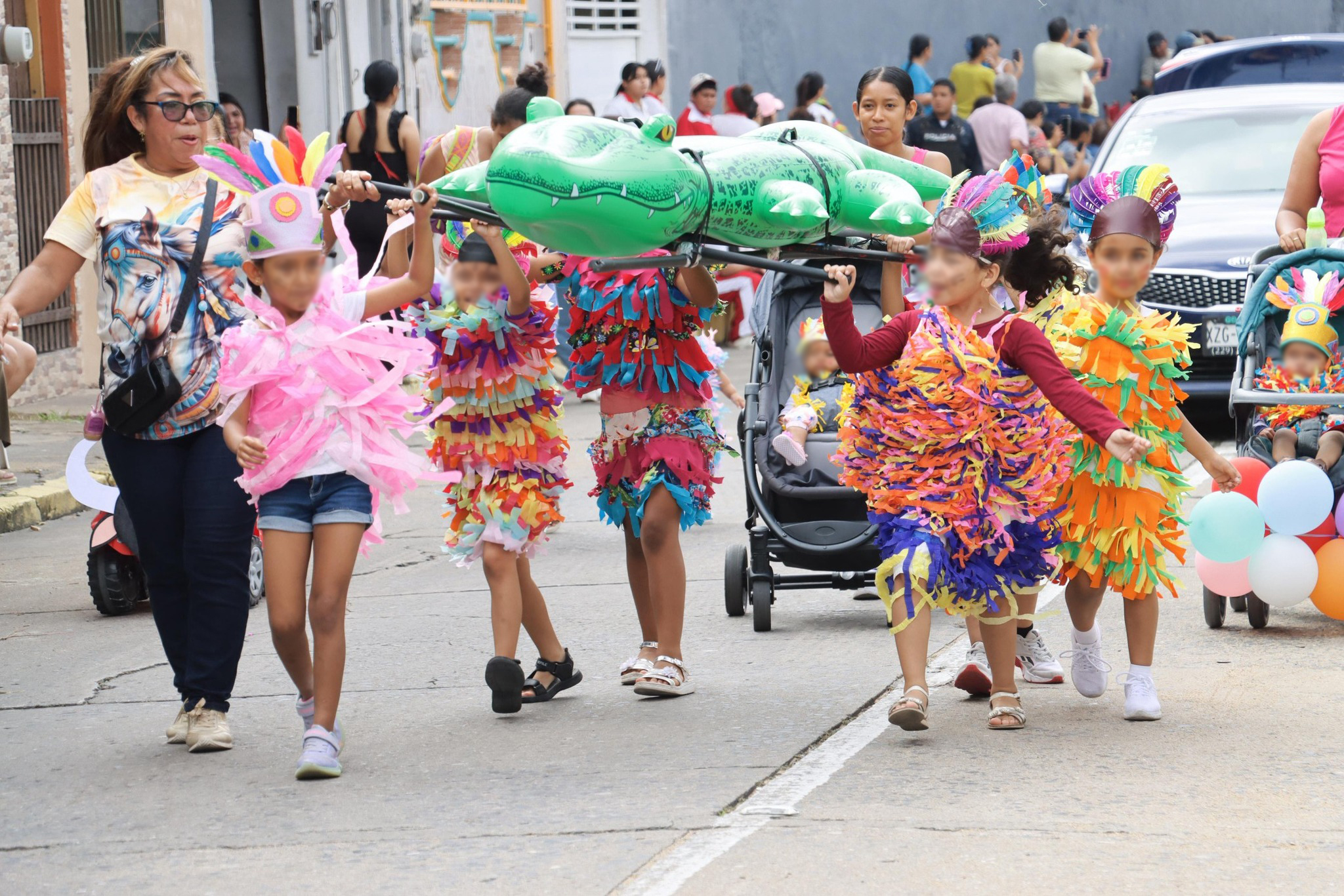 Niñas y niños de diferentes jardines de niños y primarias desfilaron con coloridos atuendos elaborados en papel china, luciendo penachos y acompañados de creativas representaciones de barcos, toros y peces, símbolos que rememoran la histórica Batalla de Lepanto.