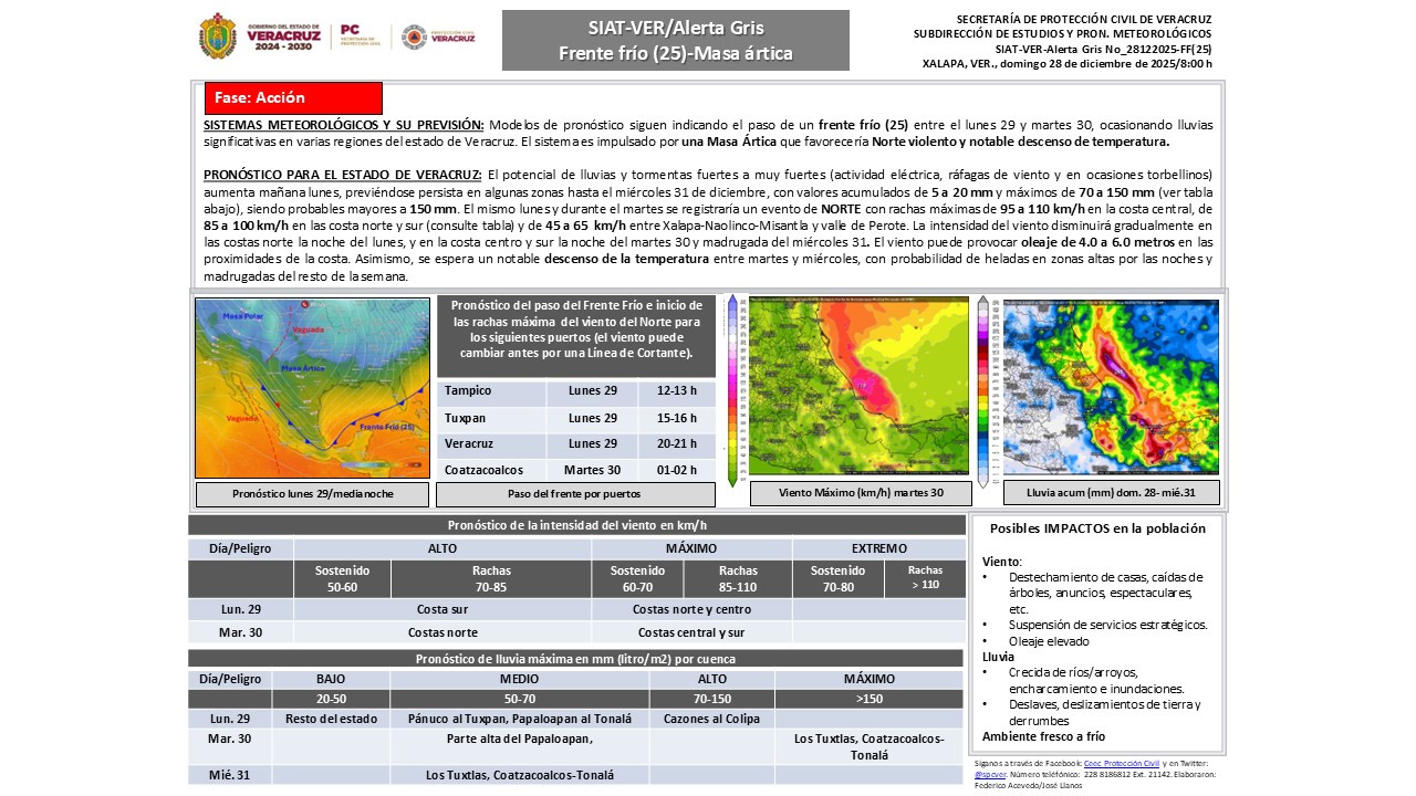 Xalapa, Ver., domingo 28 de diciembre de 2025.– La Secretaría de Protección Civil (PC) informa que, ante el pronóstico para este lunes de lluvias con acumulados probables superiores a 150 milímetros en algunos puntos de la entidad, así como un evento de Norte con rachas máximas de hasta 110 kilómetros por hora en la costa central, se mantiene activa la Alerta Gris del Sistema de Alerta Temprana de Veracruz (SIATVer), en su Fase de Acción.