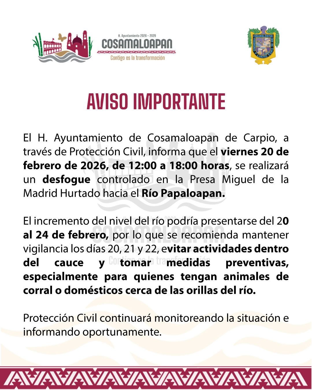 Cosamaloapan, Ver.- Atención a la ciudadanía, Protección Civil de Cosamaloapan informa sobre el desfogue controlado de la Presa Miguel de la Madrid Hurtado y las medidas preventivas por el incremento del nivel del Río Papaloapan.