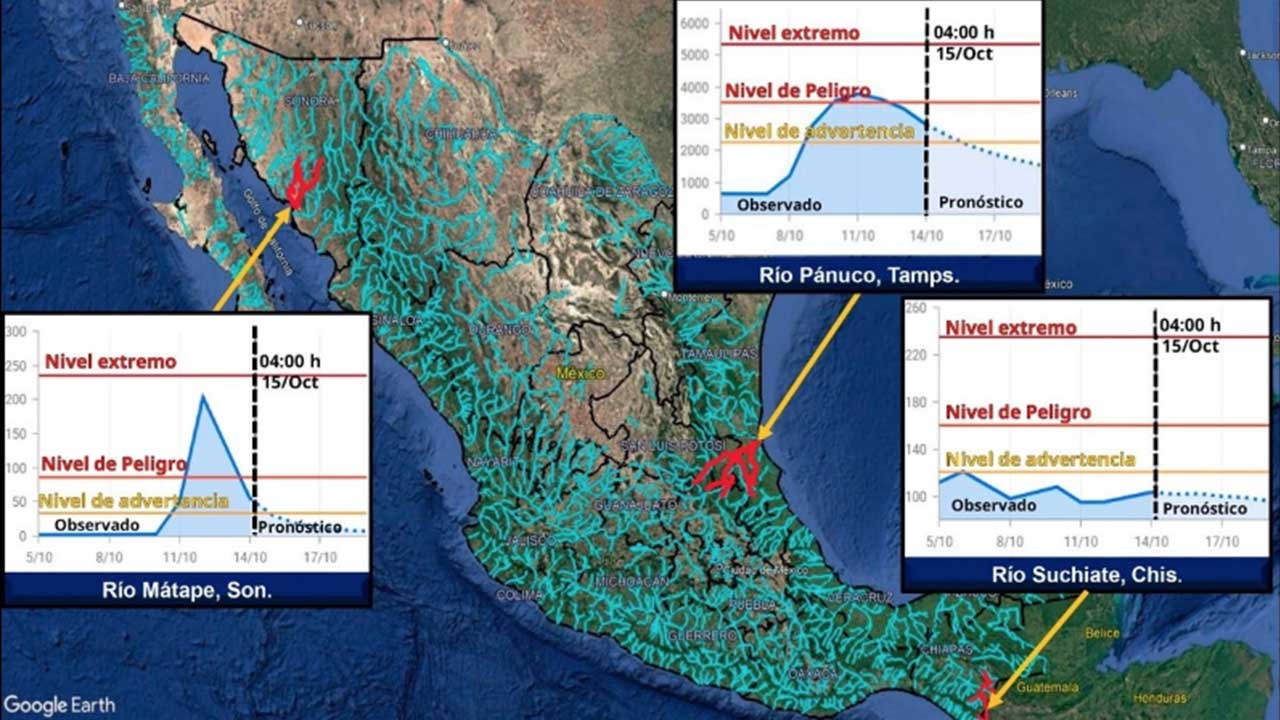 Ciudad de México.- La Secretaría de Marina-Armada de México (Semar) informó que al realizar "un monitoreo de los niveles de los ríos en el país, se encontró que los ríos Mátape en Sonora, Pánuco en Tamaulipas y Suchiate en Chiapas, son los únicos que presentan nivel de peligro y/o advertencia hasta el momento".