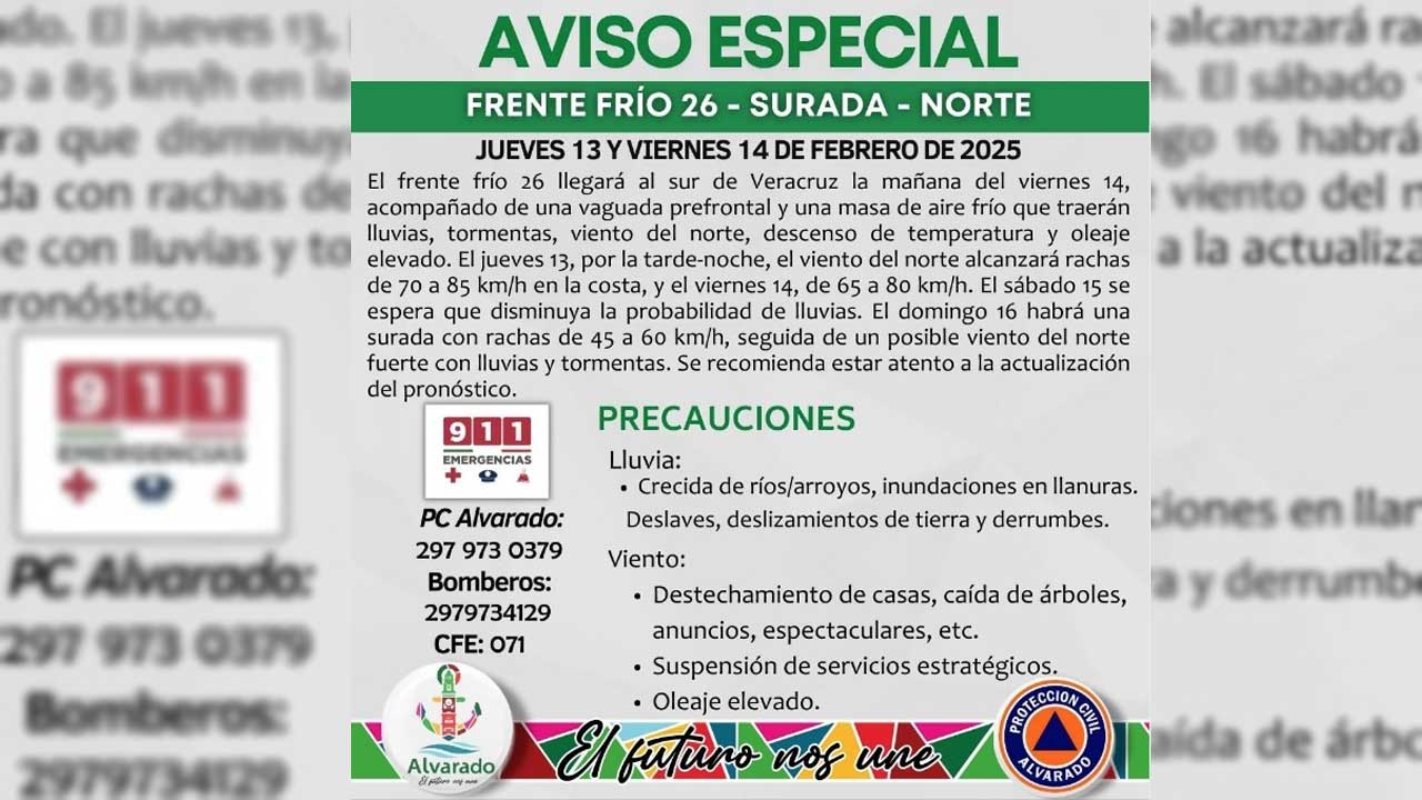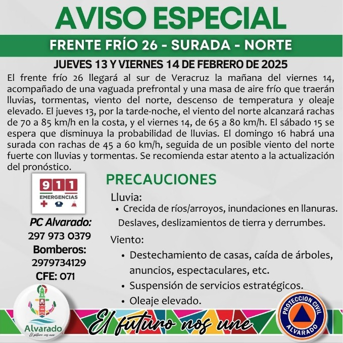 Alvarado, Ver.- El frente frío 26 llegará al sur de Veracruz la mañana del viernes 14, acompañado de una vaguada prefontal y una masa de aire frío que traerán lluvias, tormentas, viento del norte, descenso de temperaturas y oleaje elevado. El jueves 13, por la tarde-noche, el viento del norte alcanzará rachas de 70 a 85 km/h en la costa, y el viernes 14, de 65 a 80 km/h. El sábado 15 se espera que disminuya la probabilidad de lluvias.