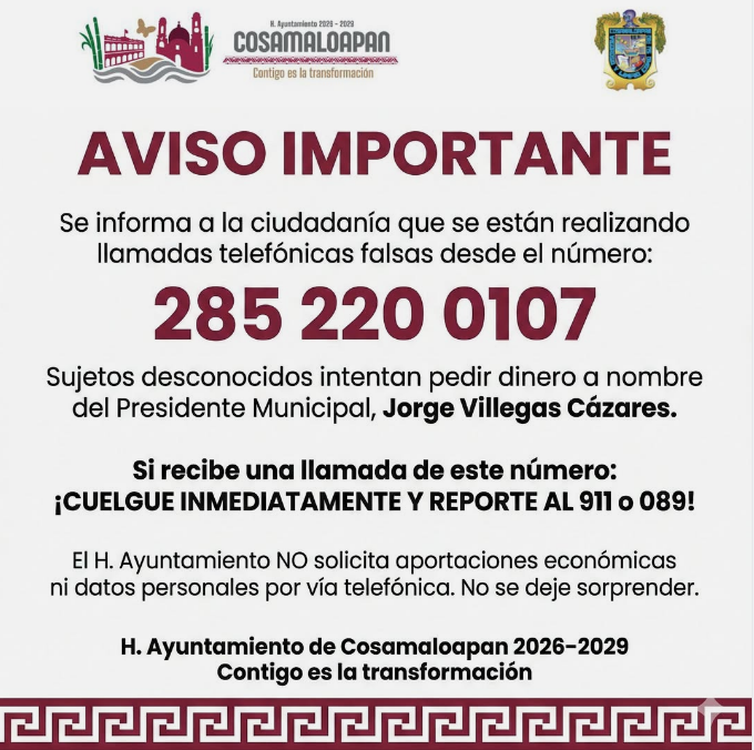 Se exhorta a la población a no dejarse sorprender, evitar proporcionar información personal o realizar cualquier tipo de depósito, y verificar siempre la información a través de los canales oficiales del H. Ayuntamiento de Cosamaloapan.