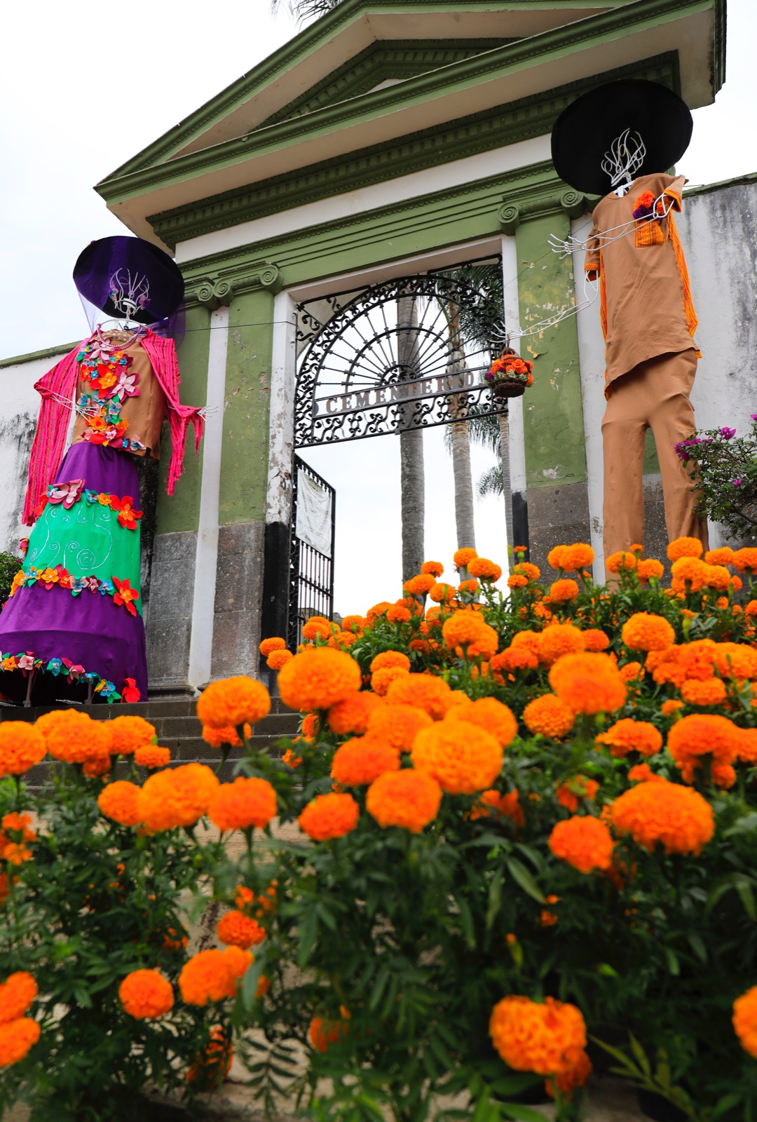 En el Panteón 5 de Febrero, declarado monumento histórico en 1986, se realizó la siembra de flor de cempasúchil y la instalación de dos catrinas que adornan el acceso principal.