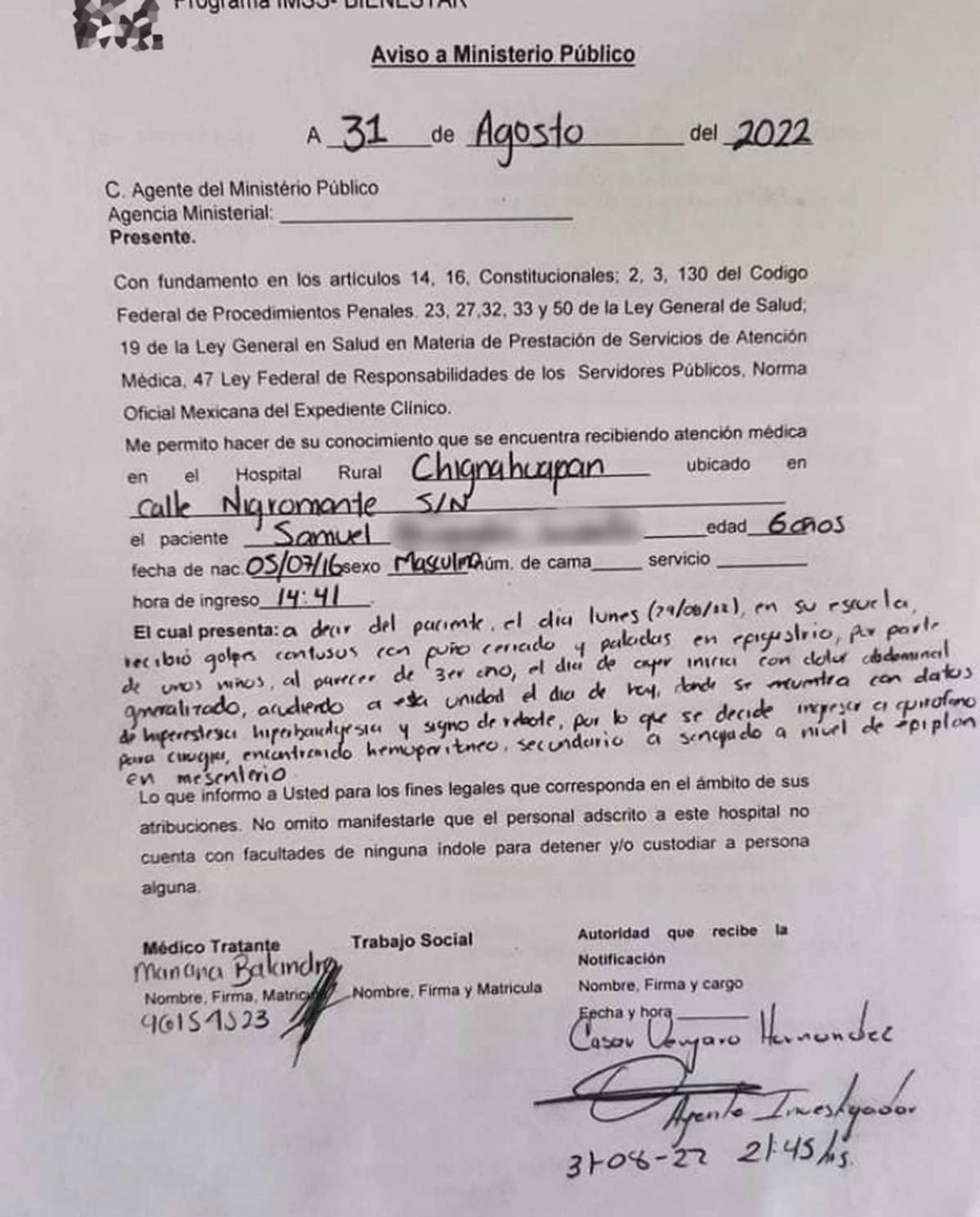 De acuerdo con el reporte médico, Samuel “N” presentó heridas en sus órganos que requirieron intervención quirúrgica. Según las indagatorias, el menor fue acorralado y brutalmente golpeado por un grupo de alumnos de tercer grado.