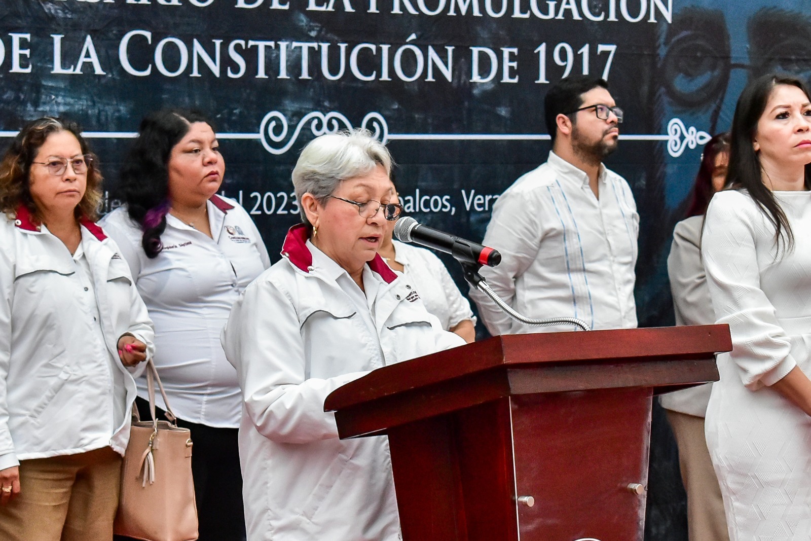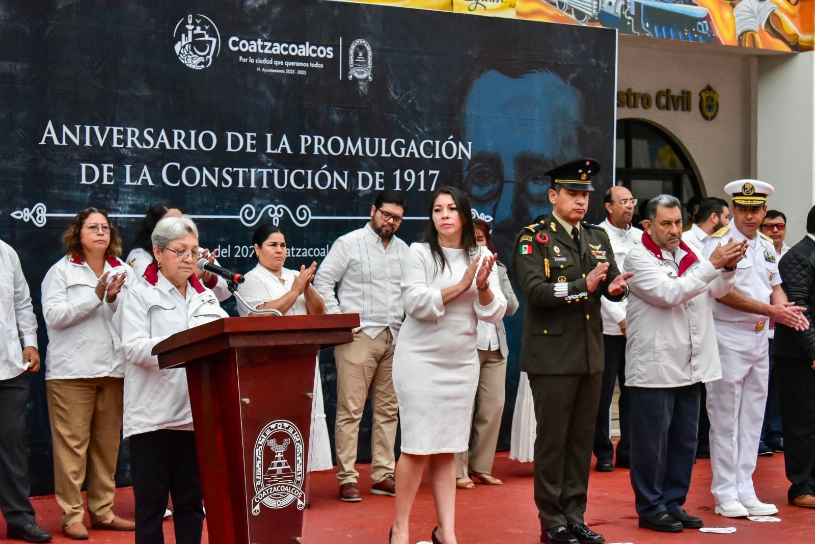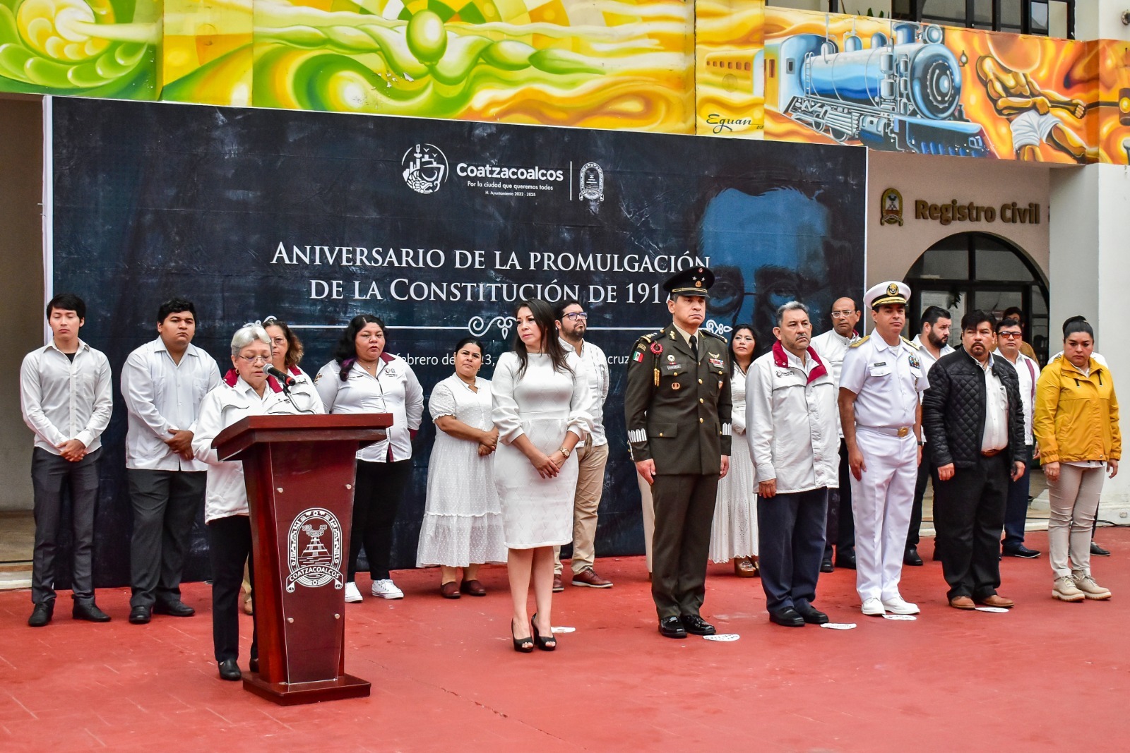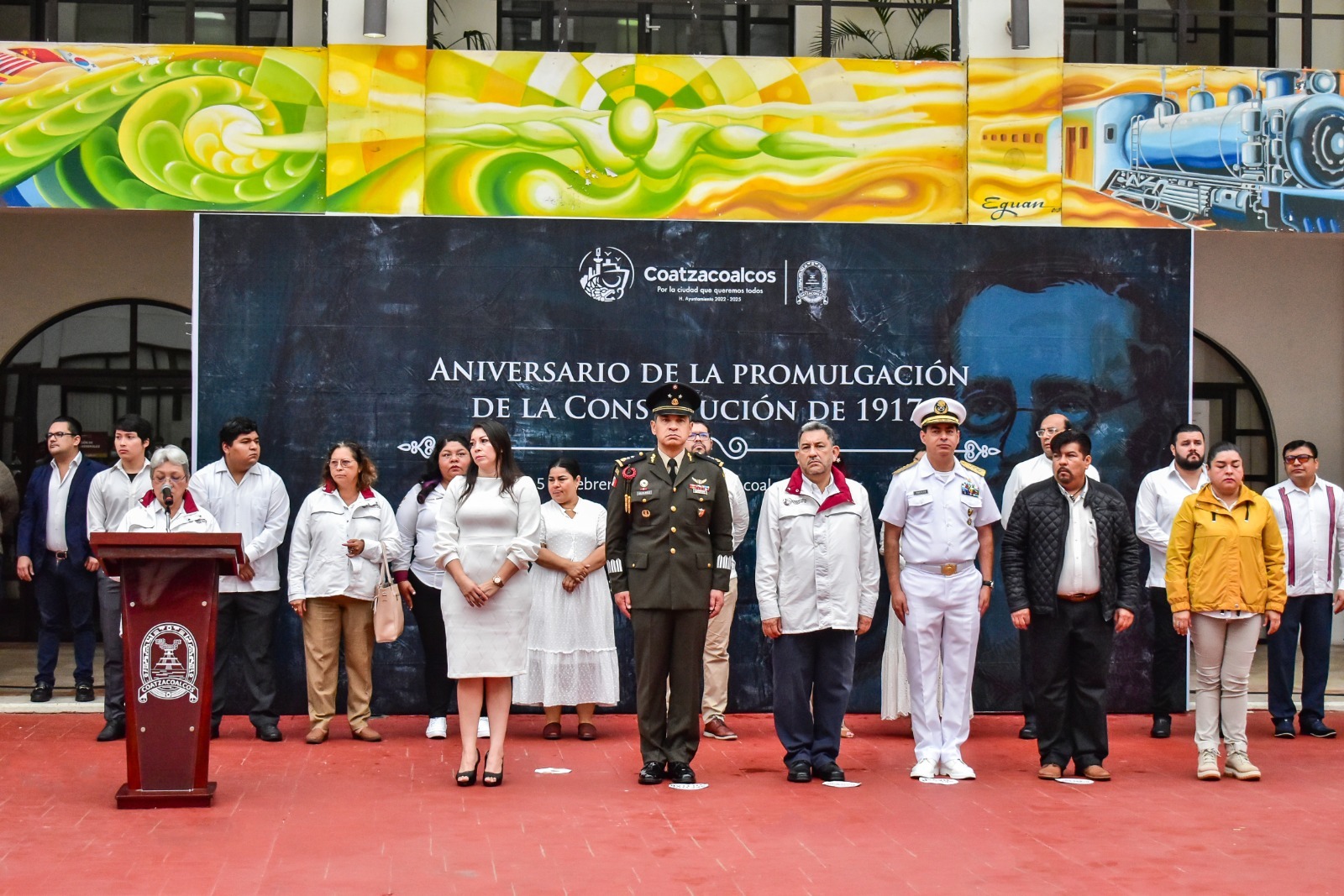 Coatzacoalcos, Ver.- La Comuna de Coatzacoalcos encabezada por el presidente municipal, Amado Cruz Malpica, conmemoró el 106 aniversario de la promulgación de la Constitución Política de México en el anexo al Palacio Municipal.