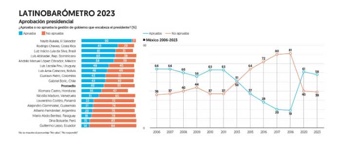 La encuesta Latinobarómetro, un estudio de opinión realizado desde 1995 con una metodología de entrevistas en vivienda, indica que los presidentes peor evaluados en la región son Dina Boluarte, de Peru, y Guillermo Lasso, de Ecuador, con 83 y 84 por ciento de desaprobación a su trabajo, similar al 81 por ciento que el estudio arrojó en México en 2018, el último año de la gestión de Enrique Peña Nieto.