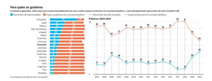 En México, el sondeo ha registrado un cambio muy marcado desde 2018 en este indicador: la proporción de personas que opina que el país se gobierna para todo el pueblo subió de 10 a 30 por ciento entre 2018 y 2020, y a 39 por ciento en 2023, sugiriendo que la gestión del presidente López Obrador ha contribuido a ese cambio de percepción.