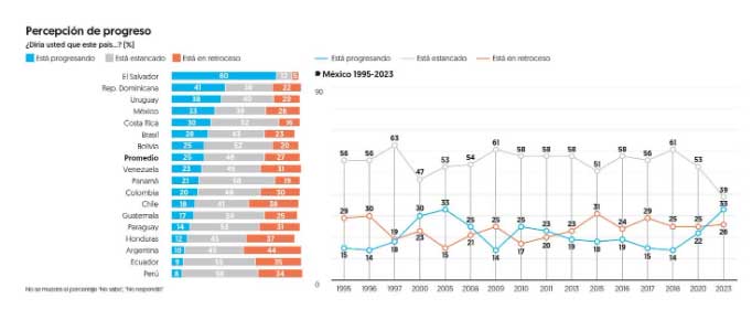 A la pregunta de si creen que el país está progresando, está estancado o va en retroceso, la región latinoamericana registró un ligero avance en la percepción de progreso en los últimos tres años, al pasar de 19 por ciento, en 2020, en medio de la pandemia, a 25 por ciento, en 2023.
