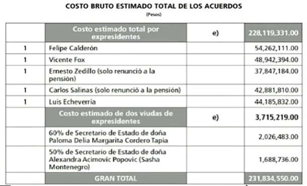 Esto suma 231 millones 834 mil 550 pesos anuales en gastos para expresidentes y viudas de ex mandatarios.