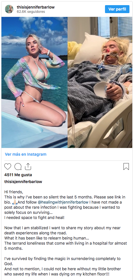 Un par de días después se desmayó de repente y su hermano la encontró inconsciente en el piso de la cocina, por lo que corrieron a urgencias, en donde finalmente los médicos descubrieron que Barlow tenía sepsis grave, una respuesta extrema del cuerpo a una infección.