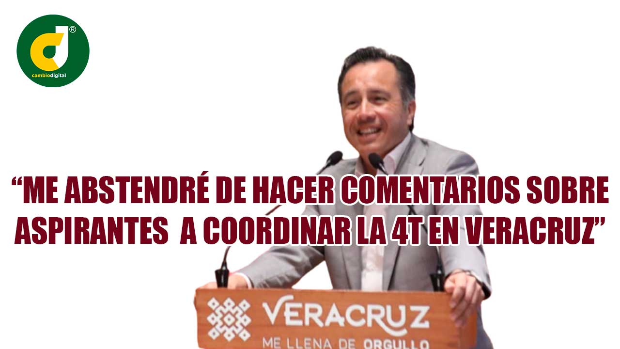 Xalapa, Ver.- “Nuevamente, hago el compromiso en pro de que democráticamente se decida, de abstenerme de hacer comentario alguno en favor en favor o en contra de alguno de los aspirantes que públicamente han declarado inscribirse ser coordinador de la Cuarta Transformación en Veracruz”, declaró el gobernador de Veracruz, Cuitláhuac García Jiménez, en conferencia de medios.