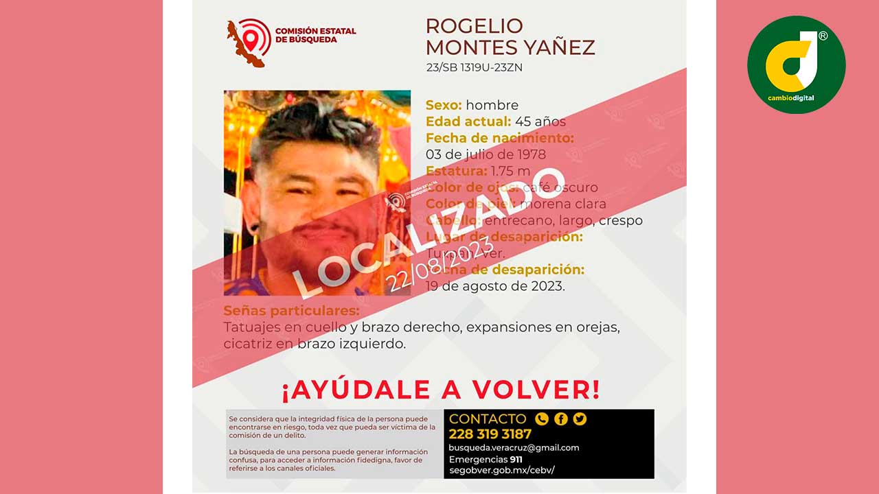 La Comisión Estatal de Búsqueda había emitido una ficha del músico de Grupo Palomo, Rogelio Montes Yáñez, de 45 años, quien fue reportado como desaparecido desde el pasado 19 de agosto, luego de que se presentaran en la Expo Feria Tuxpan, al norte de Veracruz.