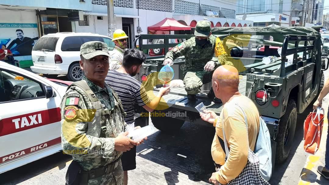 Poza Rica, Ver.- Ante las altas temperaturas que superan fácilmente los 40 grados centígrados, al continuar la tercera ola de calor en esta petrolera ciudad y al presentar varias personas los efectos de los golpes de calor, personal del 7/o Batallón de Infantería con sede en el municipio de Coatzintla, instaló un módulo de hidratación en la zona centro de esta cabecera municipal para repartir agua fresca a la población.