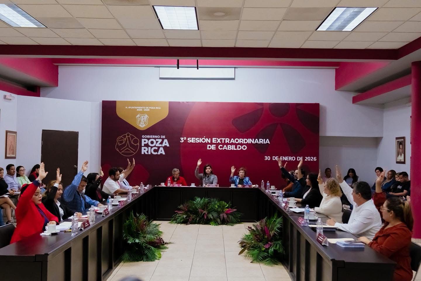Poza Rica, Ver.- En la tercera sesión extraordinaria de Cabildo, la Presidenta Municipal de Poza Rica, Adanely Rodríguez, junto con el cuerpo edilicio, aprobó una serie de acuerdos y dictámenes orientados a fortalecer la administración pública municipal y a generar beneficios directos para la ciudadanía.