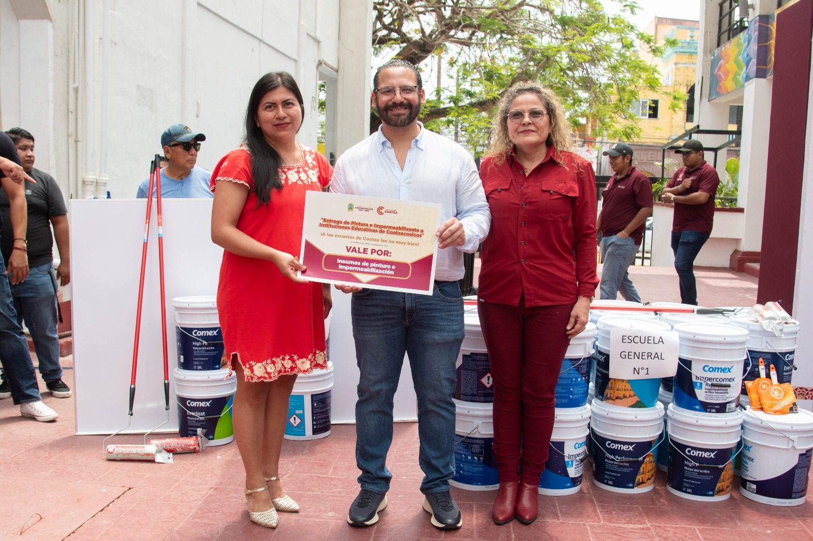 En esta primera entrega se distribuyeron 669 cubetas de pintura —291 blancas, 247 beige y 131 guinda—, además de 357 impermeabilizantes y 68 pintarrones, materiales que serán utilizados para rehabilitar aulas y distintas áreas de los planteles educativos.