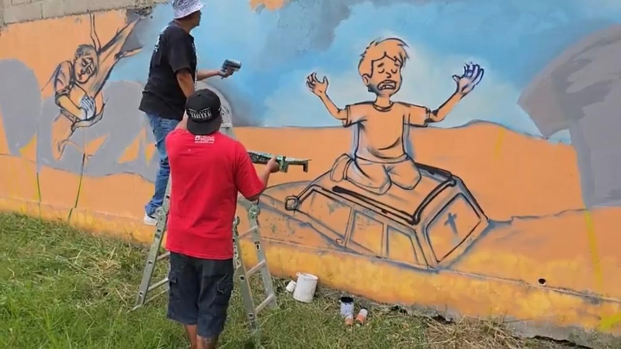 Artistas urbanos pintan mural en homenaje a damnificados por las inundaciones en Poza Rica