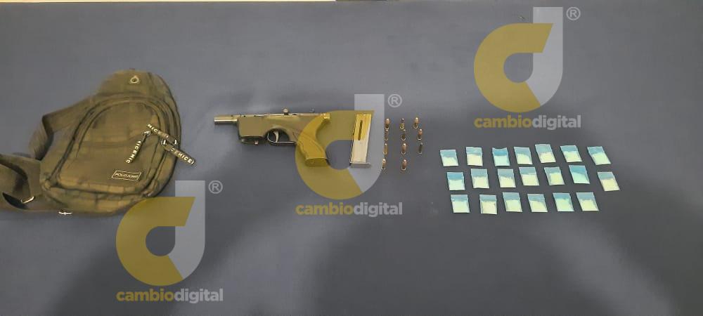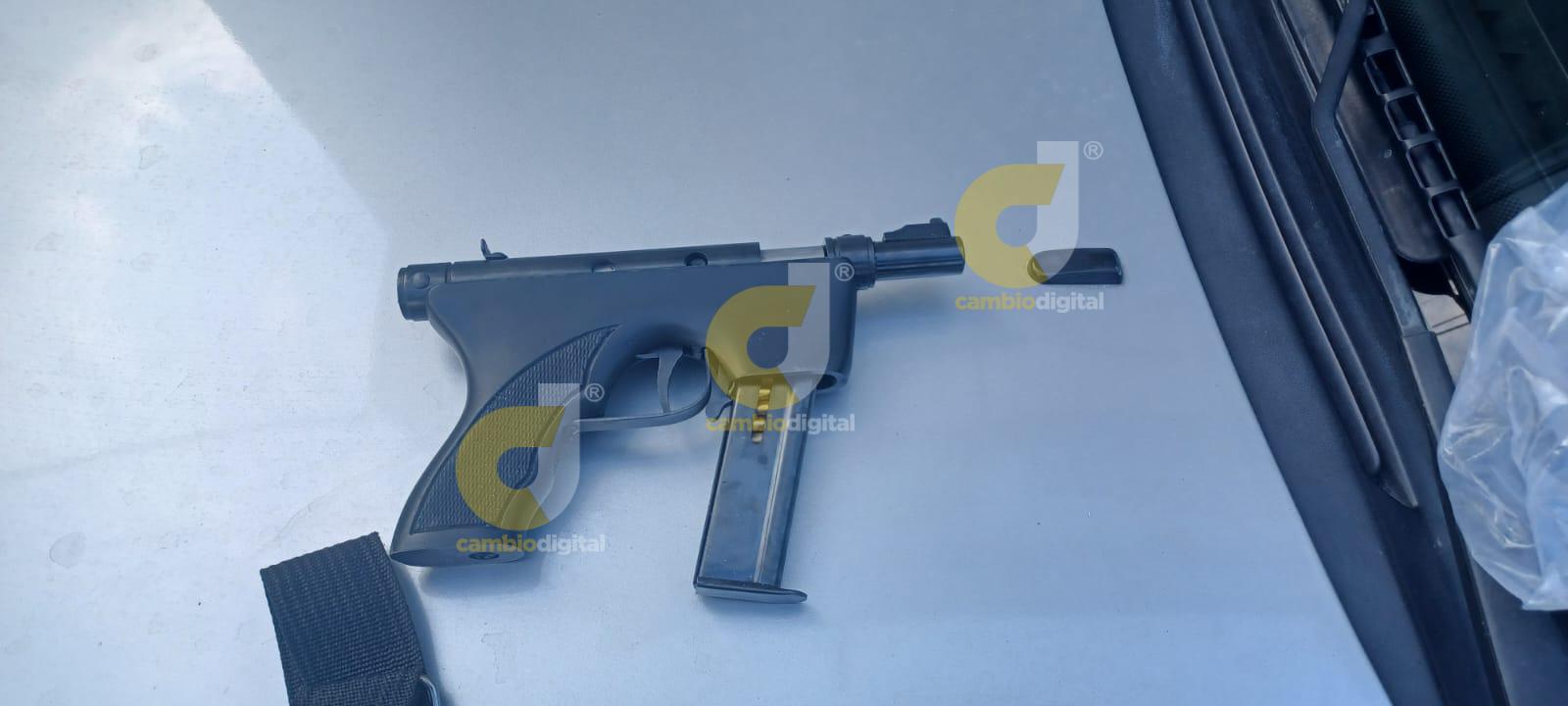 Al realizar una revisión en la unidad motriz, los policías estatales ubicaron una mochila en el piso del lado del copiloto donde sobresalía un arma de fuego, siendo asegurada una pistola tipo semiescuadra color negro, sin marca y sin matrícula con calibre .22 con su cargador abastecido junto con 11 cartuchos útiles.