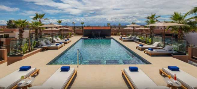 Con el uso de tonalidades como el rosa o cobre, combinado con blanco, logra un relajado ambiente en su lounge y bar, que se adorna con mesas bajas y en forma de círculo. También cuenta con una alberca al aire libre, centro fitness, jardín y terraza.