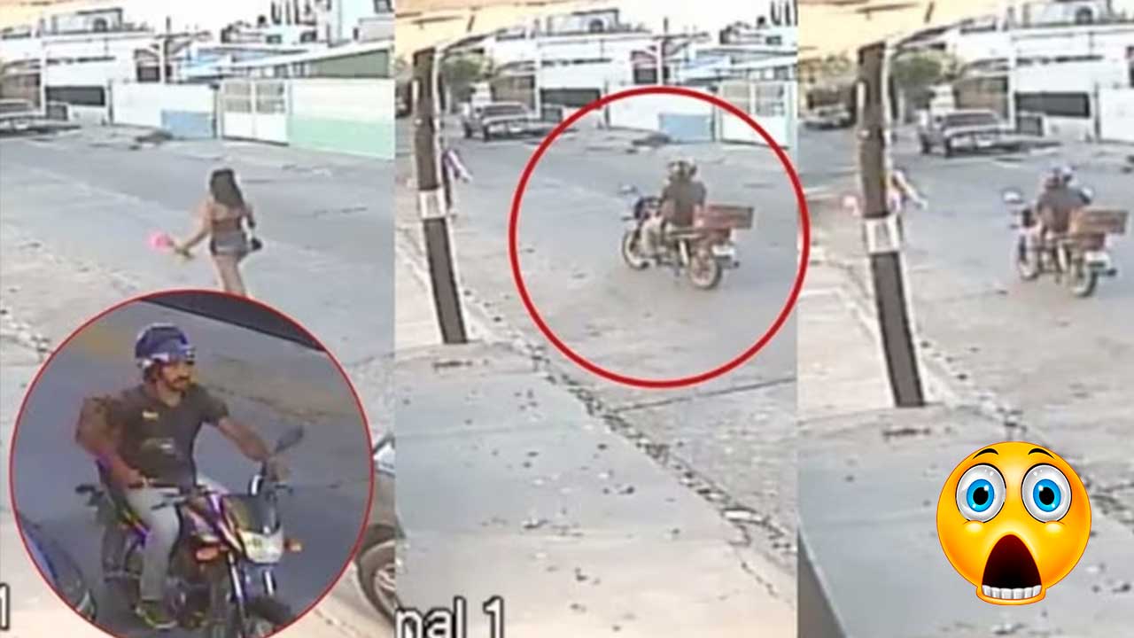 Las imágenes muestran al sujeto, quien utiliza un casco y circula en una motocicleta con una caja atrás, acercarse con su vehículo a la joven y picar su glúteo con un objeto, se presume que se trata de un picahielo.