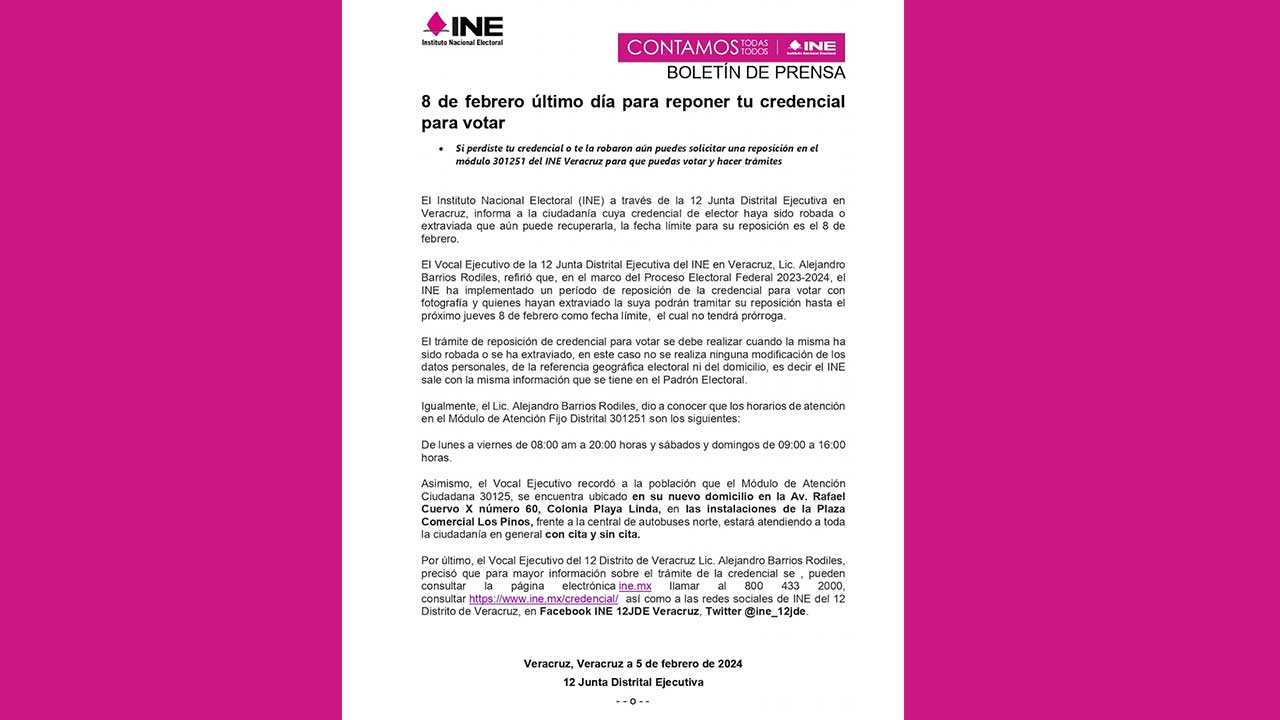 El Vocal Ejecutivo de la 12 Junta Distrital Ejecutiva del INE en Veracruz, Lic. Alejandro Barrios Rodiles, refirió que, en el marco del Proceso Electoral Federal 2023-2024, el INE ha implementado un período de reposición de la credencial para votar con fotografía el cual concluye hasta el próximo jueves 8 de febrero como fecha límite, y no tendrá prórroga.