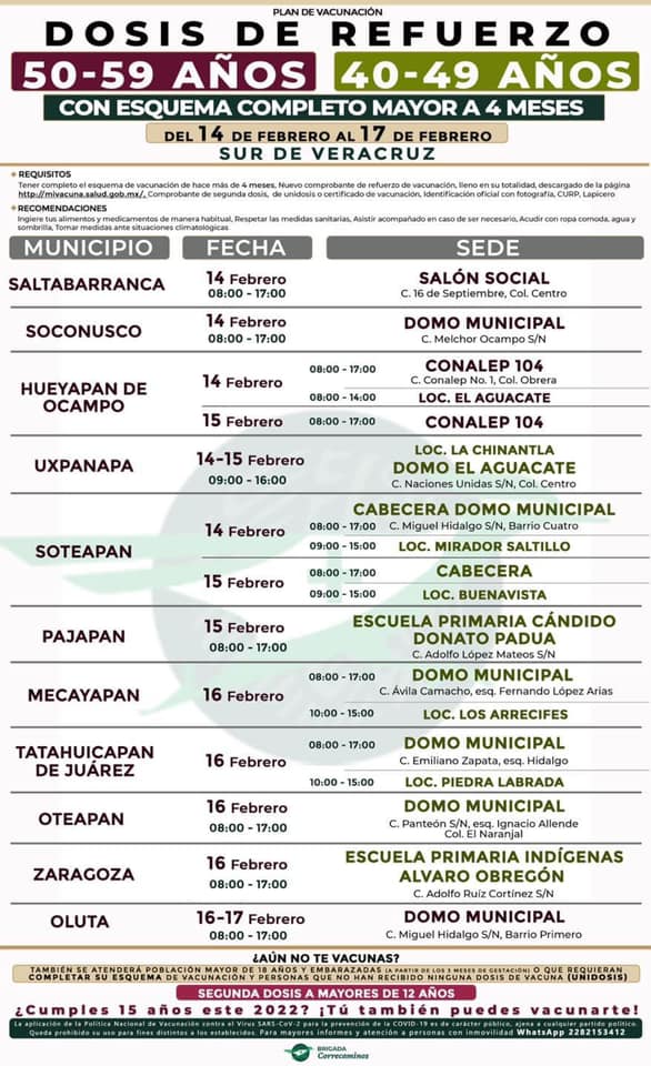 ¡Atención Hueyapan de Ocampo! Va dosis de refuerzo a los de 40-59 años 14 y 15 de febrero