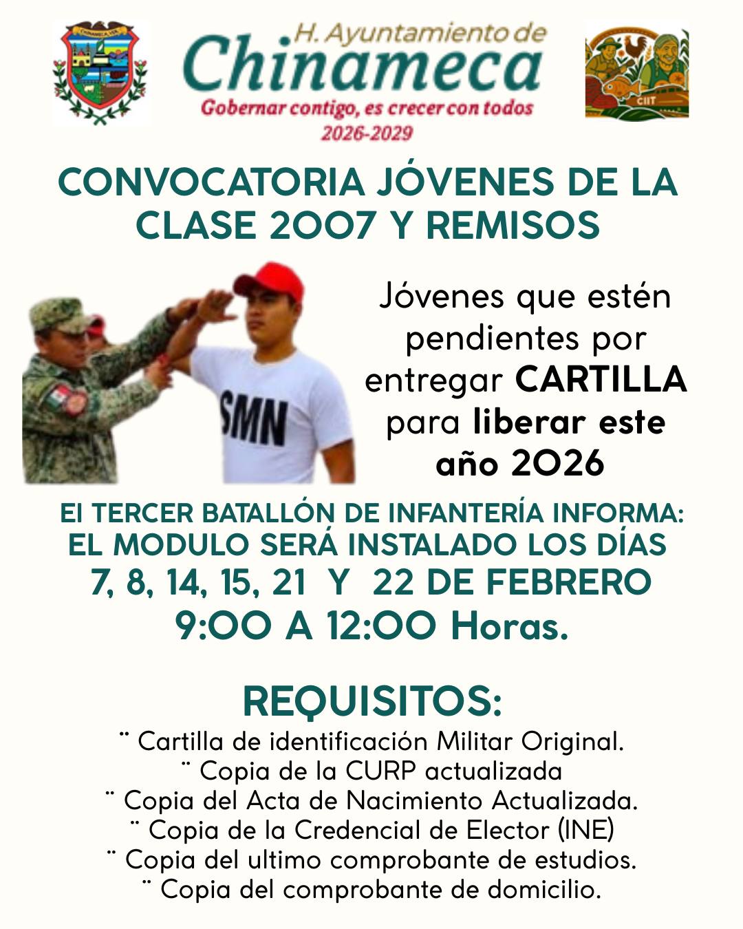 Chinameca, Ver.- El H. Ayuntamiento de Chinameca que preside Santiago Cortés Padua en coordinación con la Sindicatura única, informa a los jóvenes de la Clase 2007 y remisos, que se amplió el periodo de recepción de cartillas para los siguientes días 7, 8, 14, 15, 21 y 22 de febrero.