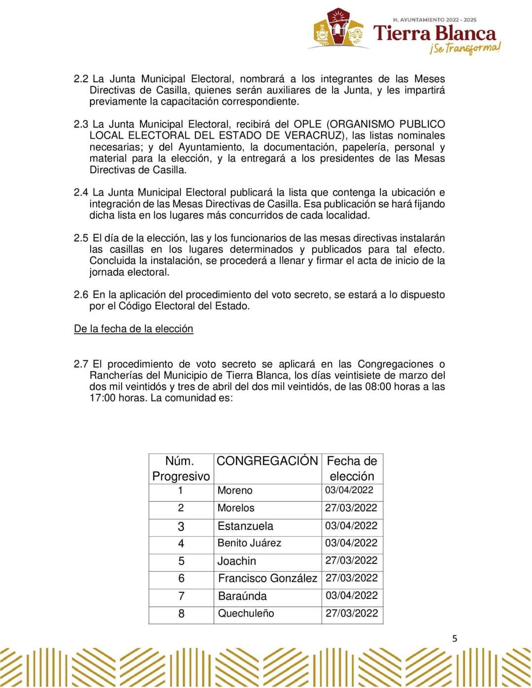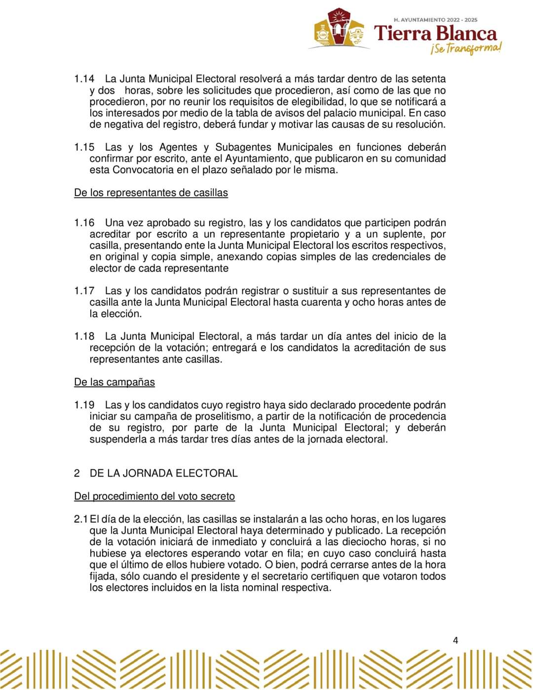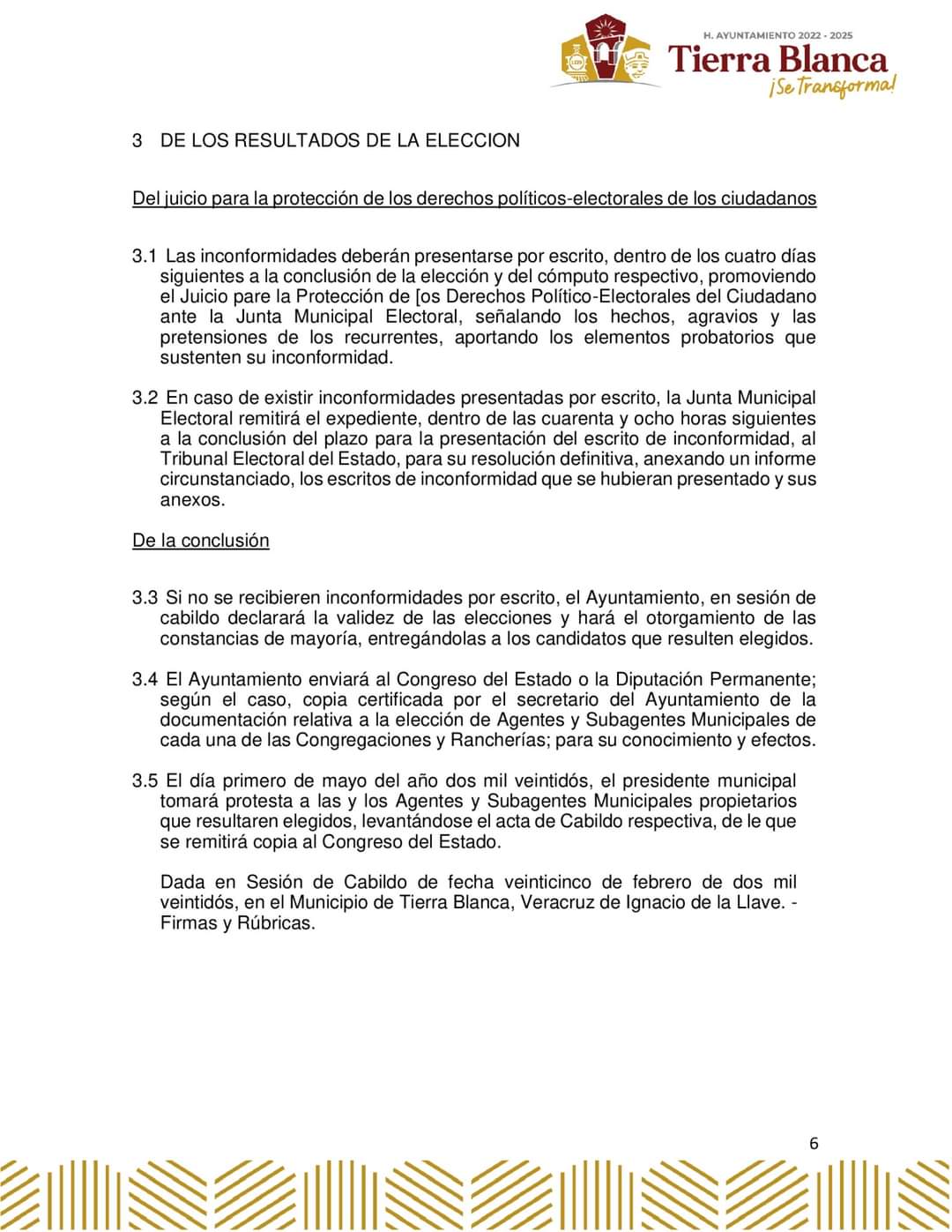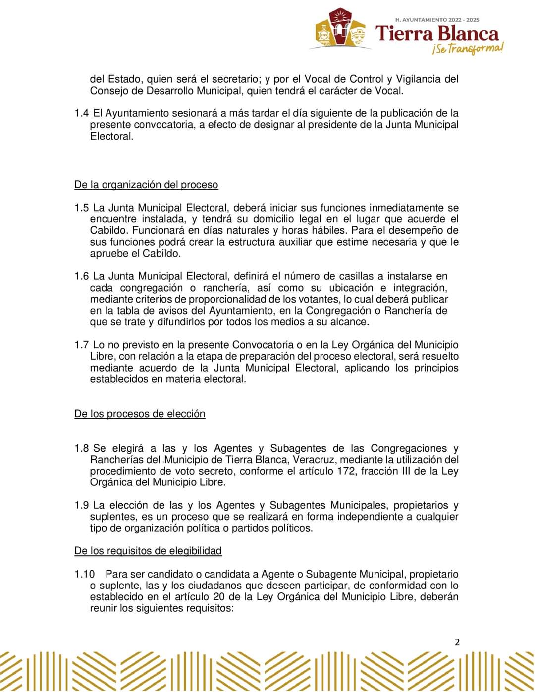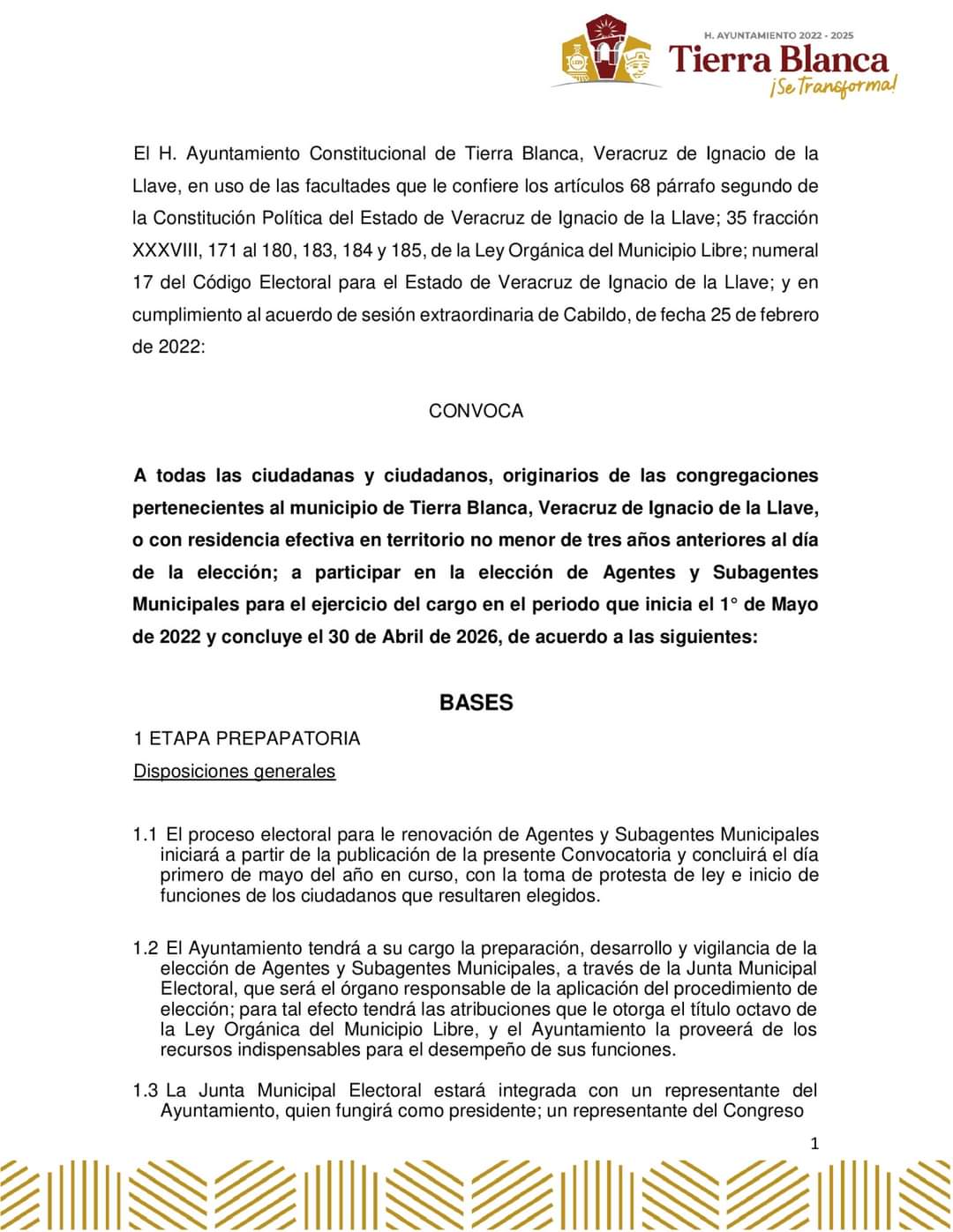 Convocatoria Abierta para todas las ciudadanas y ciudadanos, originarios de las congregaciones pertenecientes al municipio de Tierra Blanca, para participar en la elección de Agentes y Subagentes Municipales para el ejercicio del cargo en el periodo que inicia el 1° de Mayo de 2022 y concluye el 30 de Abril de 2026.