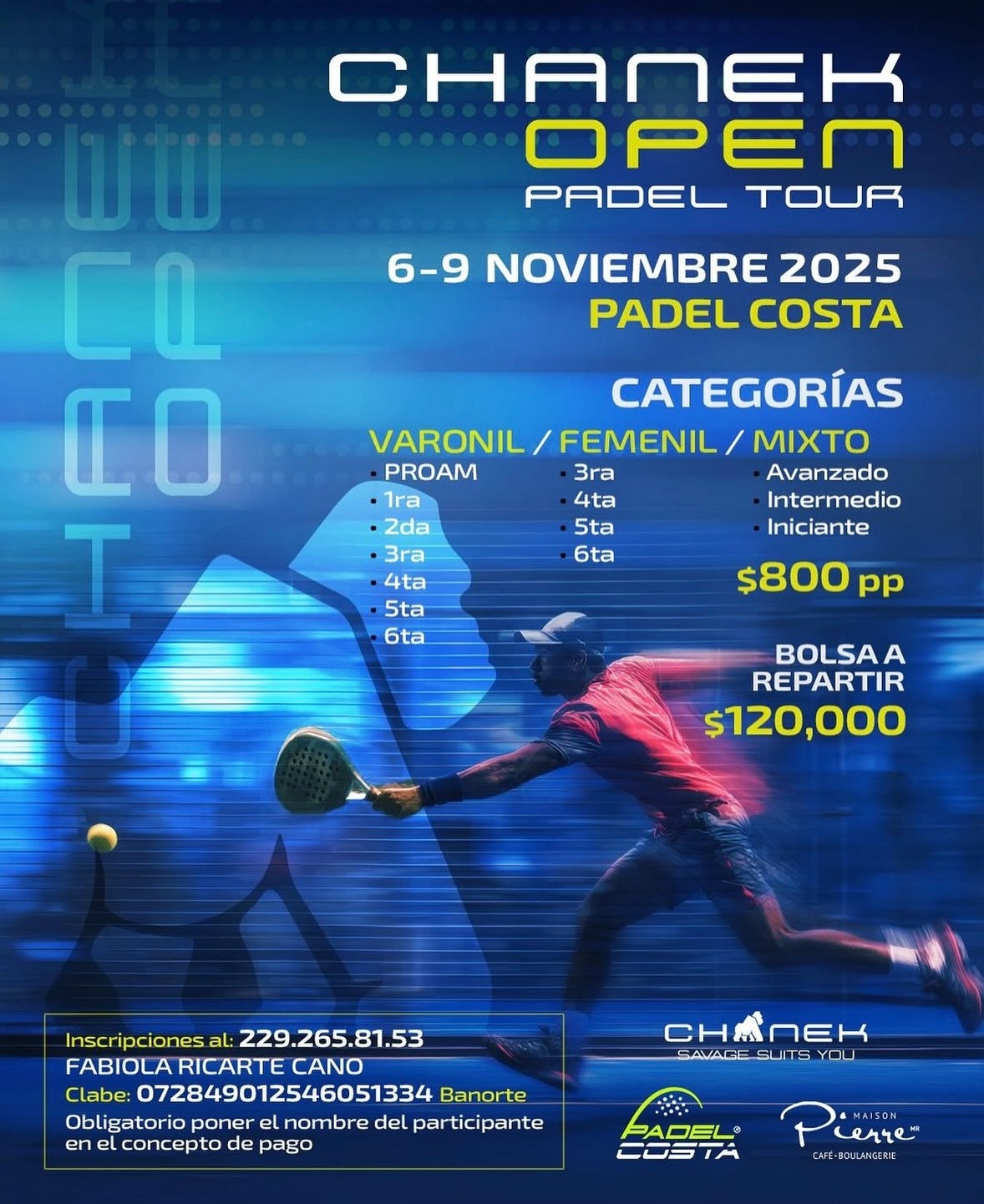 Las canchas de las instalaciones del Pádel Costa Veracruz se vestirán de gala del 6 al 9 de noviembre, al recibir una de las competencias más esperadas del calendario nacional: El Chanek Open Padel Tour, certamen que reunirá a destacados jugadores y jugadoras de distintas categorías y niveles competitivos.