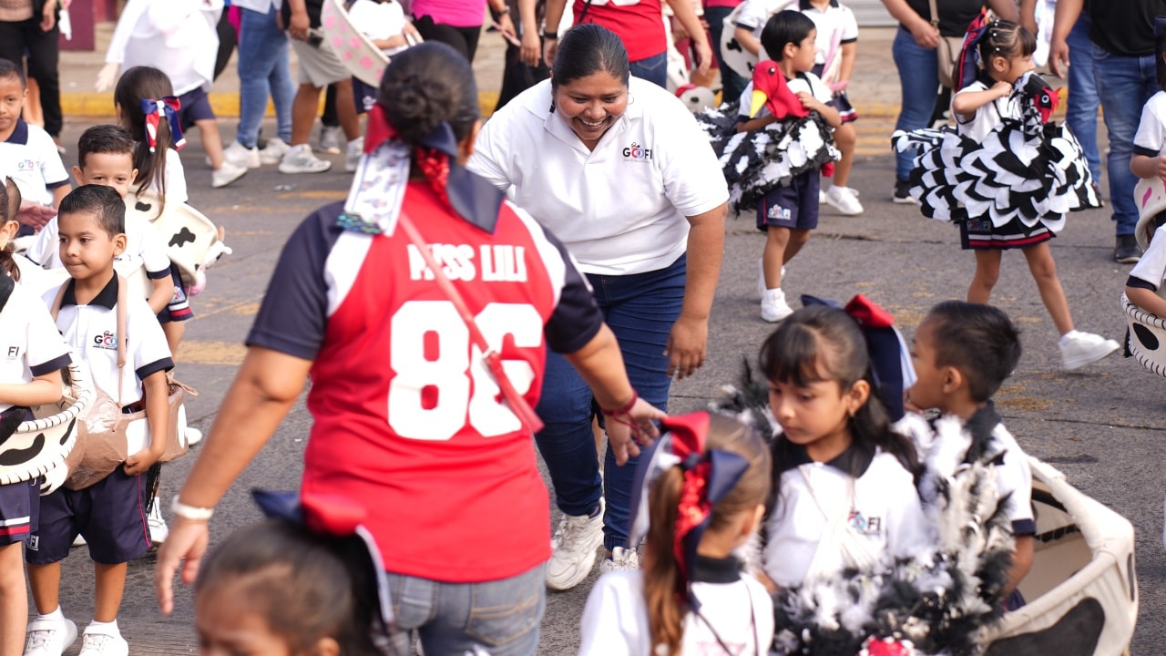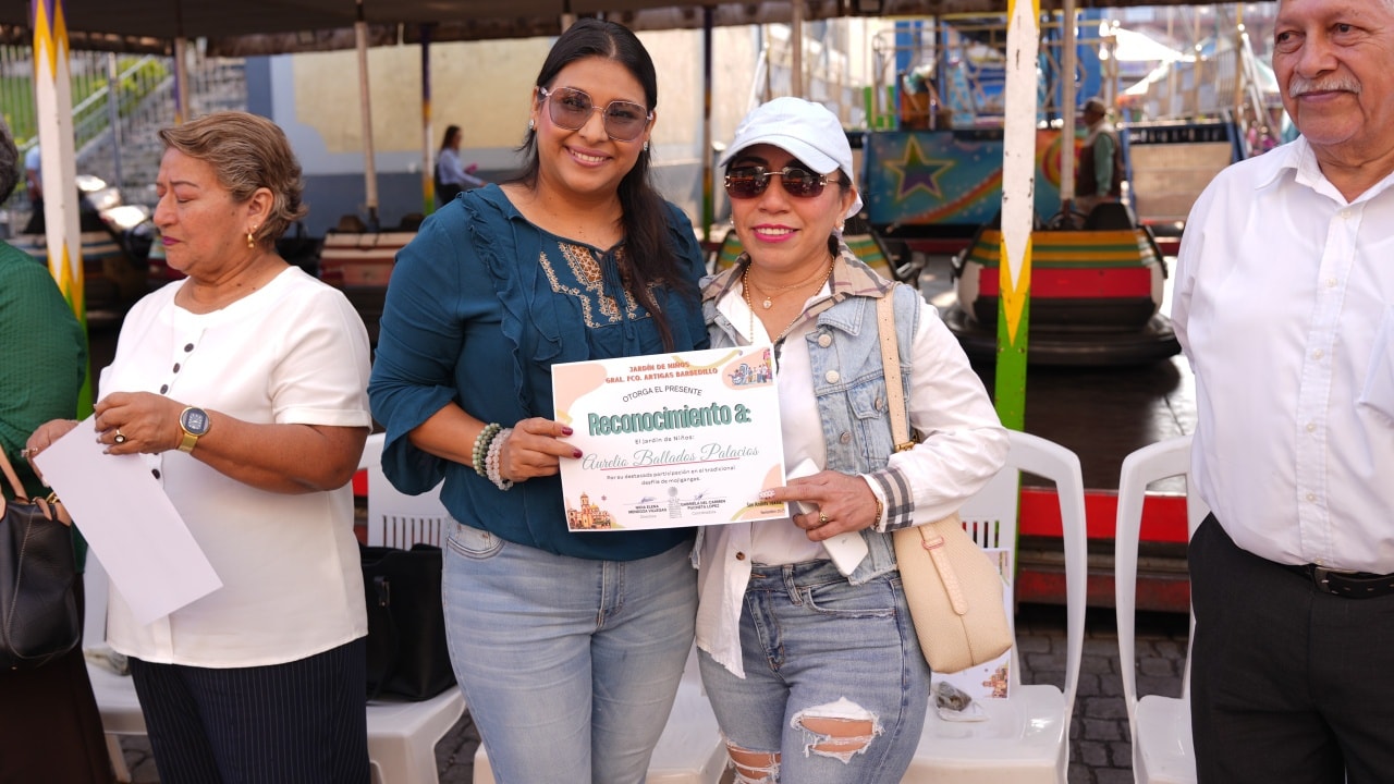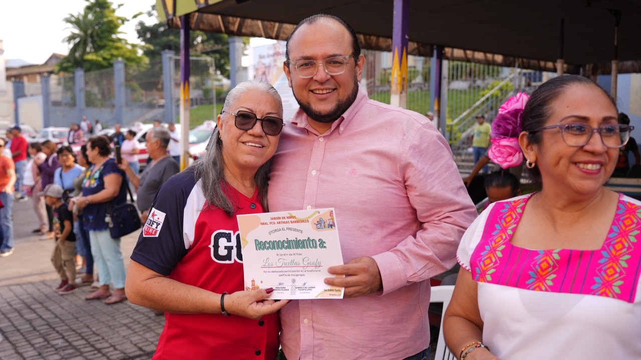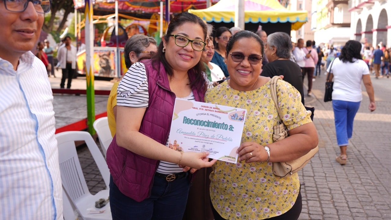 San Andrés Tuxtla, Ver.- En el marco de las actividades culturales que clausuran las Fiestas Patronales en honor a San Andrés Apóstol, este lunes la Presidenta Municipal de San Andrés Tuxtla, la doctora María Elena Solana Calzada, junto con ediles de la administración municipal, presidió el desfile infantil de alumnos de preescolar, alusivo a la Mojiganga 2025.