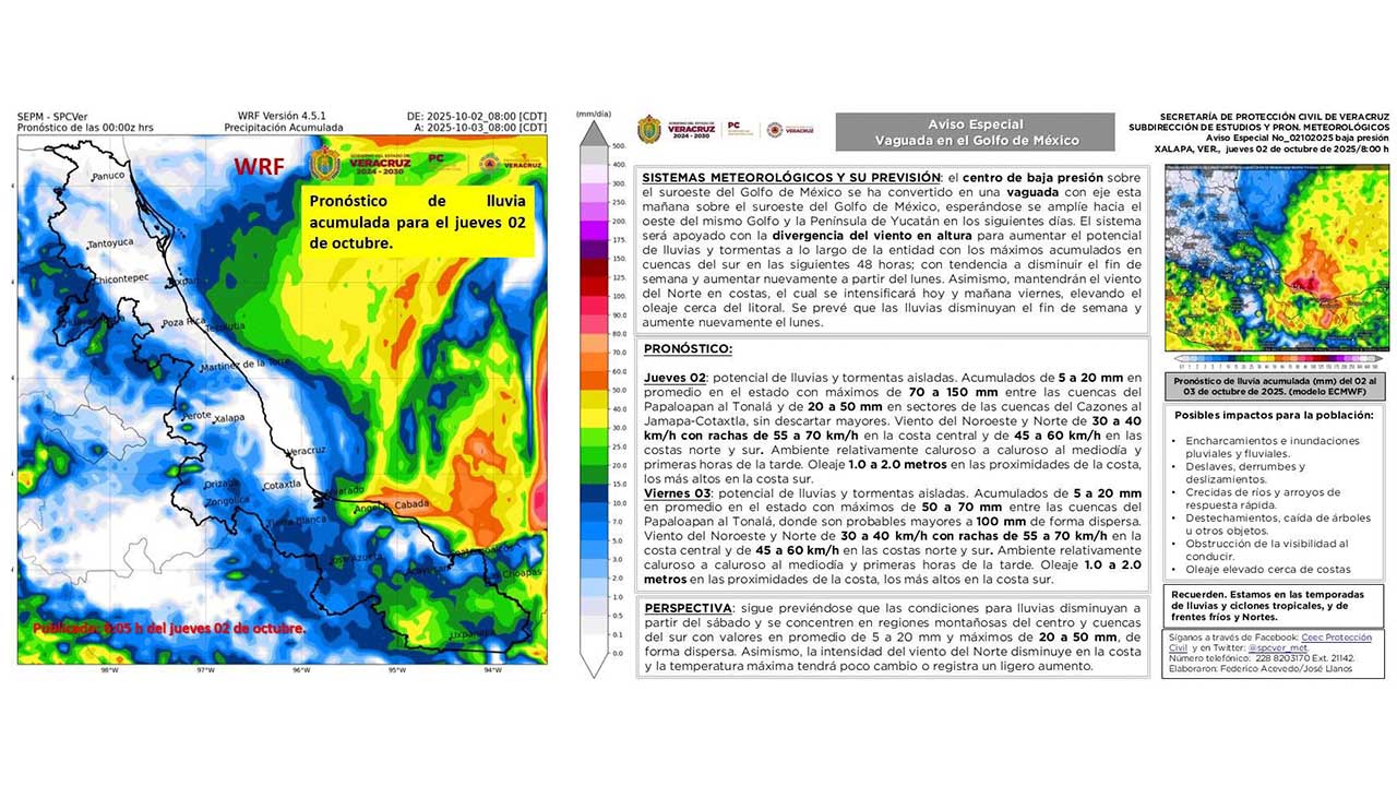 Jueves 02: potencial de lluvias y tormentas aisladas. Acumulados de 5 a 20 mm en promedio en el estado con máximos de 70 a 150 mm entre las cuencas del Papaloapan al Tonalá y de 20 a 50 mm en sectores de las cuencas del Cazones al Jamapa-Cotaxtla, sin descartar mayores. Viento del Noroeste y Norte de 30 a 40 km/h con rachas de 55 a 70 km/h en la costa central y de 45 a 60 km/h en las costas norte y sur. Ambiente relativamente caluroso a caluroso al mediodía y primeras horas de la tarde. Oleaje 1.0 a 2.0 metros en las proximidades de la costa, los más altos en la costa sur.