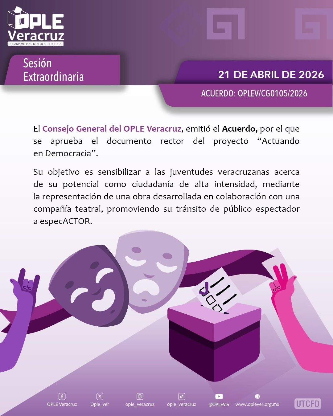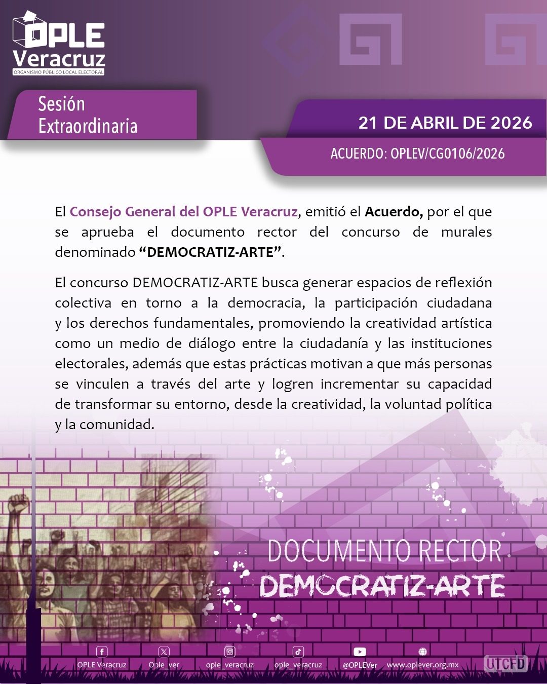 • Con el objetivo de fomentar la participación ciudadana, se presentaron los documentos rectores del proyecto “Actuando en Democracia” y del concurso de murales “DEMOCRATIZ-ARTE”