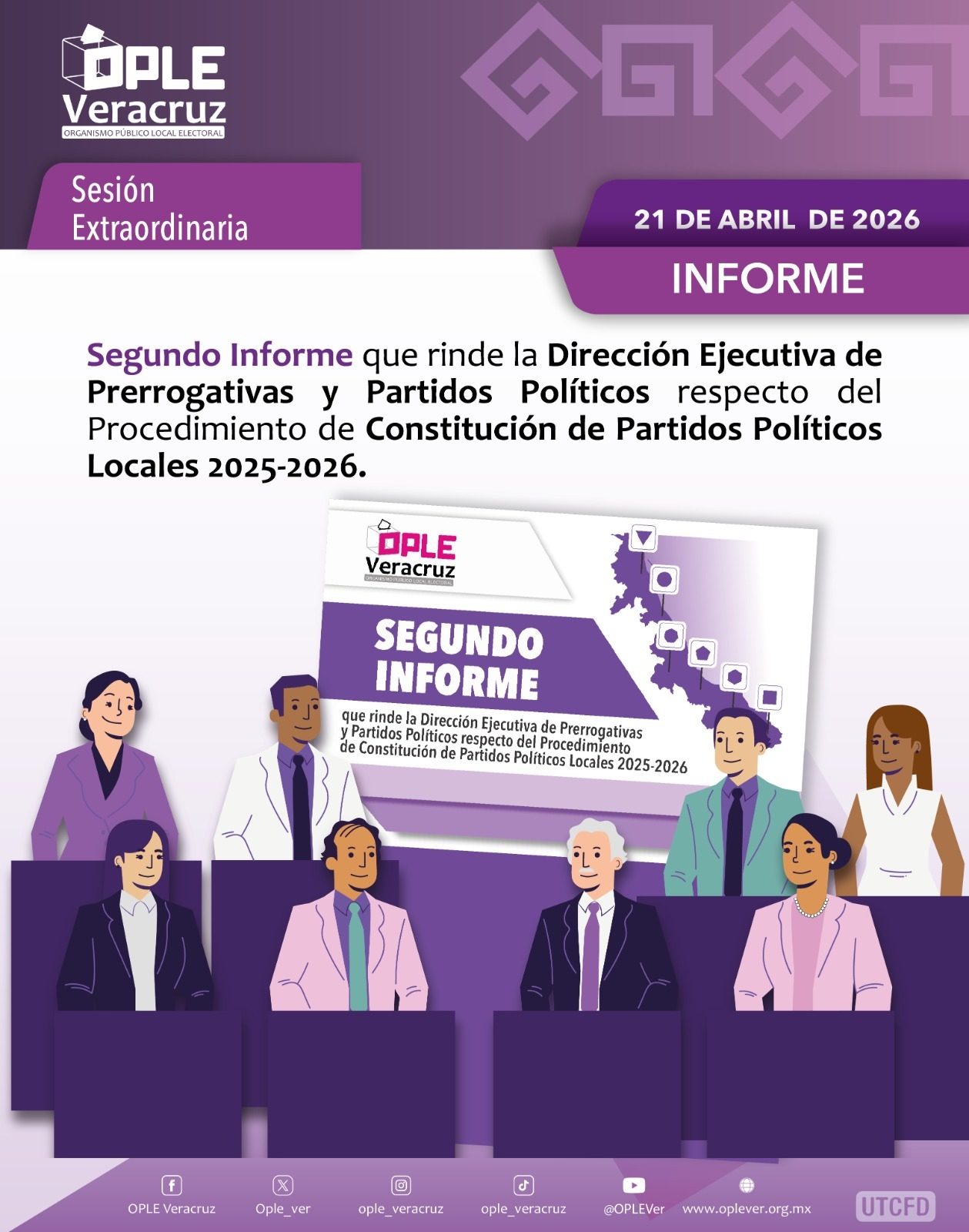 Xalapa, Ver.- En sesión extraordinaria, se presentó ante el Consejo General del Organismo Público Local Electoral del Estado de Veracruz (OPLE Veracruz) el segundo informe que rinde la Dirección Ejecutiva de Prerrogativas y Partidos Políticos respecto del Procedimiento de Constitución de Partidos Políticos Locales 2025-2026.