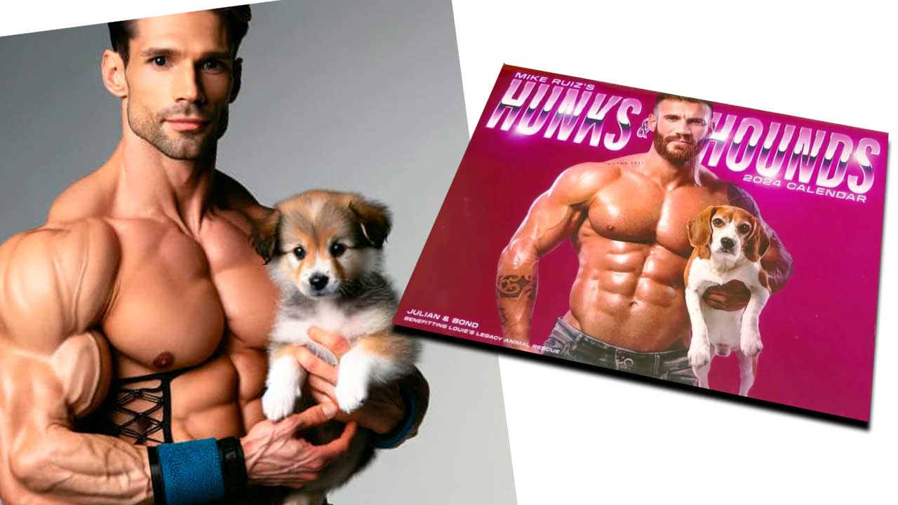 Las fotos de “Hunks and Hounds” incluyen a hombres musculosos posando con encantadores perros de rescate.