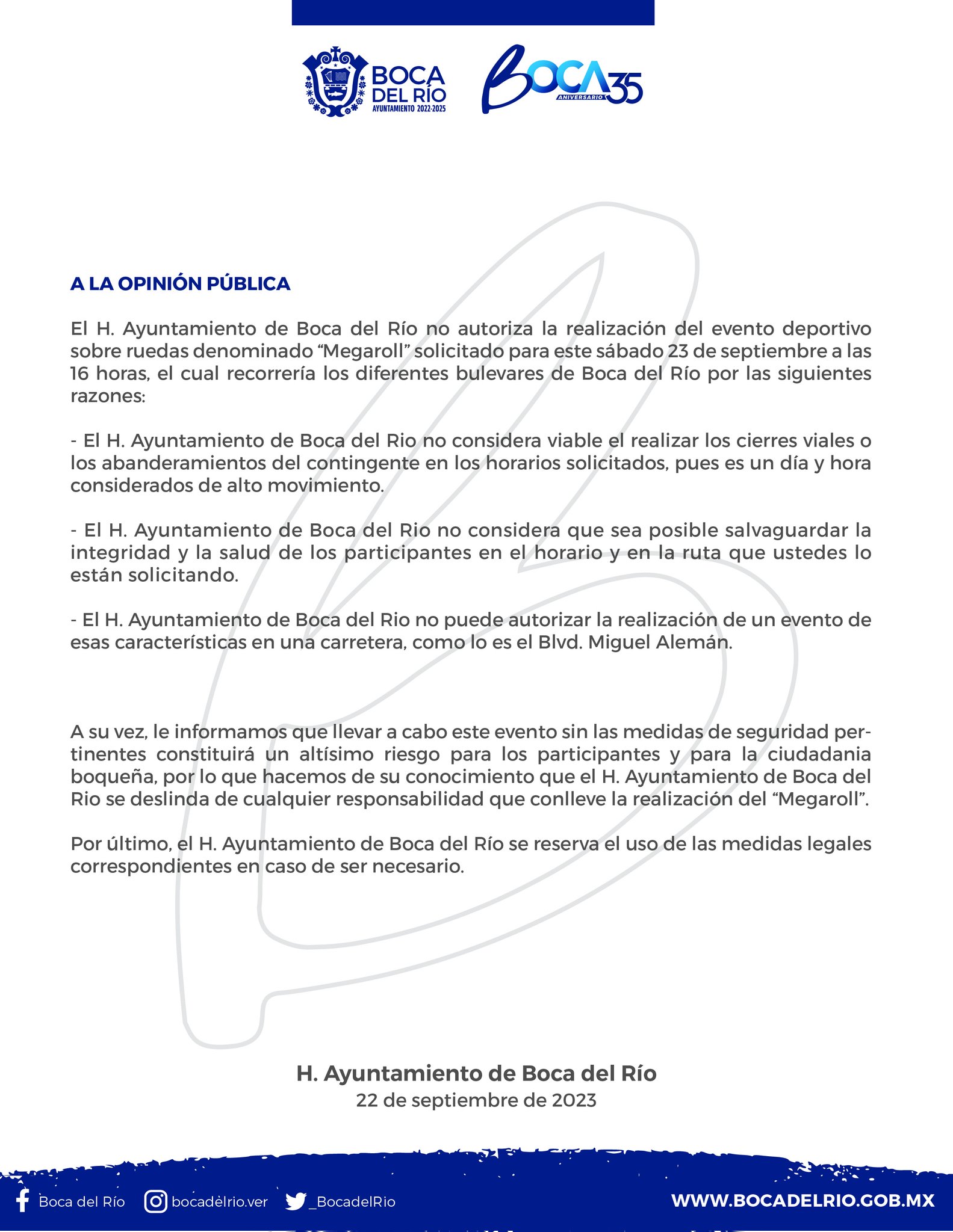 Ayuntamiento de Boca del Río no autoriza realización del evento deportivo "Megaroll"